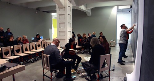 Discussioni preliminari alle realizzazioni hanno stabilito un confronto costante sul lavoro, seguendo il filo di un discorso svelato gradualmente nel suo prendere corpo. Gli autori e i relatori dei numerosissimi contributi, cui si rimanda al programma per un’esauriente narrazione, intervengono più volte, anche nella stessa giornata, talvolta in vesti differenti. Così avviene per gli accademici Claudia Melica e Gabriele Guerra, che dopo aver contribuito rispettivamente con le relazioni Libertà e rivoluzione (sul tema beuysiano nella filosofia e nella poesia di Friedrich Schiller) e La parola e l’immagine. Stefan George, poeta tedesco (in cui si analizza la figura dell’artista liturgico, sacerdote dell’arte), prendono parte attiva alle performance di Polidori ispirate a Beuys e, nel caso di Melica, anche agli Esercizi di lettura che si tengono in due occasioni insieme a Federica Santoro, Tianyi Xu e Daniele Villa Zorn. Molti, fra gli autori, accolgono la diretta collaborazione di Polidori, che si esplicita nelle loro stesse opere. Citando qualche esempio, nelle pubbliche conversazioni con Ugo Brugnoli Di me so tutto (tranne il nome) e con Mariateresa Sartori per la presentazione delle opere sonore di quest’ultima; nel colloquio registrato con Luca Miti che evolve nella performance n domande a Luca Miti, con n + 1 risposte; nel video intitolato The (more than) 7 deadly sentences of Giuseppe Garrera’s book, dove si conduce un’azione poetica utilizzando il libro di Garrera Storie di collezionismo di strada; nel far tradurre da Frank Hornung alcune poesie di Cesare Pietroiusti per una pubblicazione a stampa; nel concepire il concerto testuale di Tomaso Binga accompagnato dall’interpretazione del Minima Vocalia Ensemble; nelle interviste La strada del latte di Ferruccio De Filippi e Conferma di sensibilità di Francesco Impellizzeri; nell’uso delle voci registrate di Laura Palmieri, Enzo Rosato, Primarosa Cesarini Sforza e infine nelle stampe di ingrandimenti fotografici per i lavori di Silvia Bordini, Roberto De Simone, Mauro Folci, Mauro Piccini, Villa Zorn e Mirc Zantor, “contaminandoli” nel proprio modo di operare con il mezzo cartaceo. Altri interventi si sono invece avvicinati a Polidori indagando alcuni aspetti “intorno” alla linea d’ombra, fra cui la relazione (e il limite) fra parola e immagine, con la èkphrasis di Beatrice Peria sulla conversione di Paolo e l’analisi di Riccardo Capoferro de La linea d’ombra di Conrad, sull’attraversamento verso un’altra condizione con figure ispirate al romanzo nel cinema e nel fumetto. Il concetto di trasformazione emerge nei residui oleosi della pittura su carta di Luigi Battisti, nella relazione di Monica Cristina Storini sulle tecniche di sopravvivenza nella scrittura femminile e nelle immagini che testimoniano i passaggi compiuti nell’arte da Dora Stiefelmeier e Mario Pieroni, mentre l’idea di forma indistinta o precaria appartiene alle delicate trasparenze di Bruno Lisi, ai materiali rifiutati di Andrea Lanini in Mondo Arte e al nero magmatico che pervade il lavoro di Rita Mandolini, fino all’annullamento della parola tramite la ri-scrittura compressa che claudioadami esegue con i testi di Samuel Beckett.