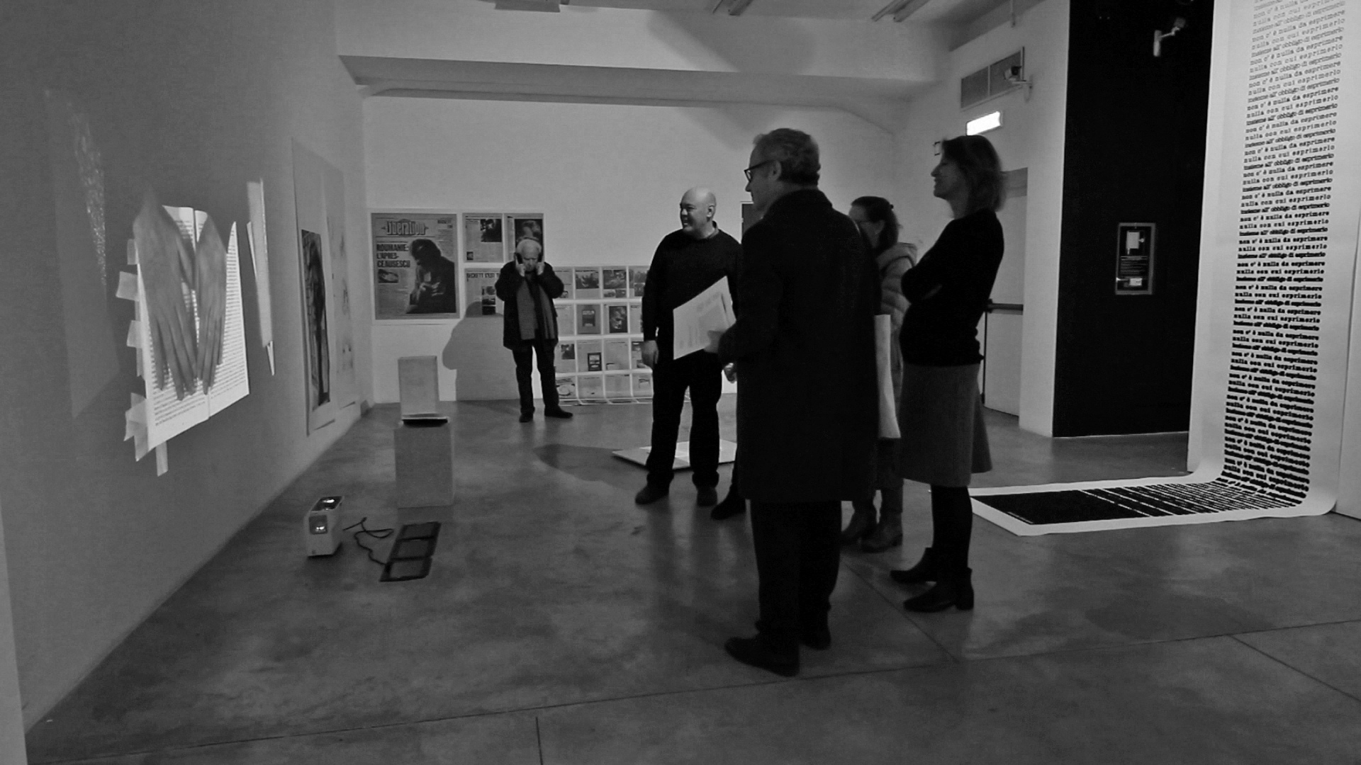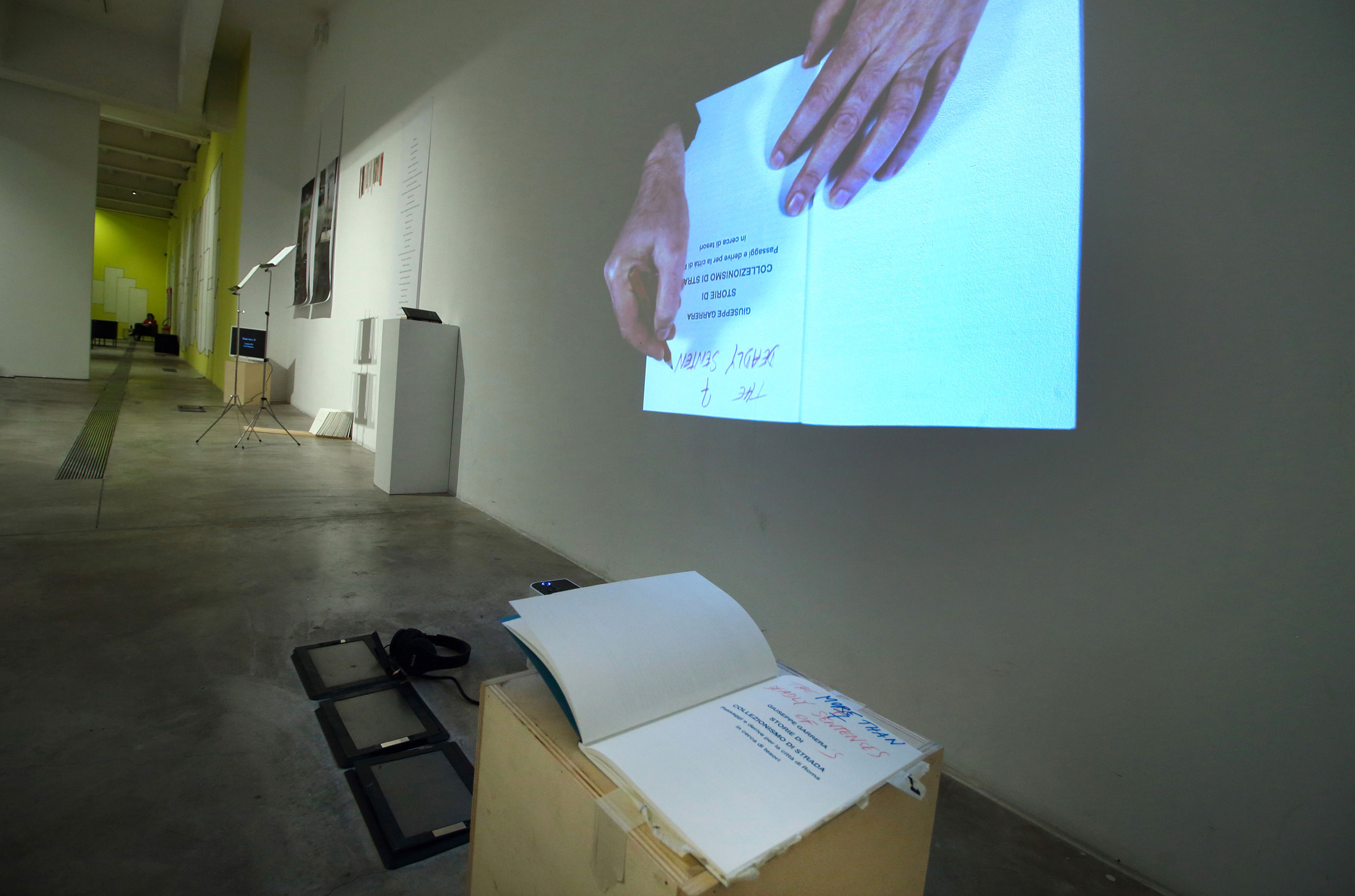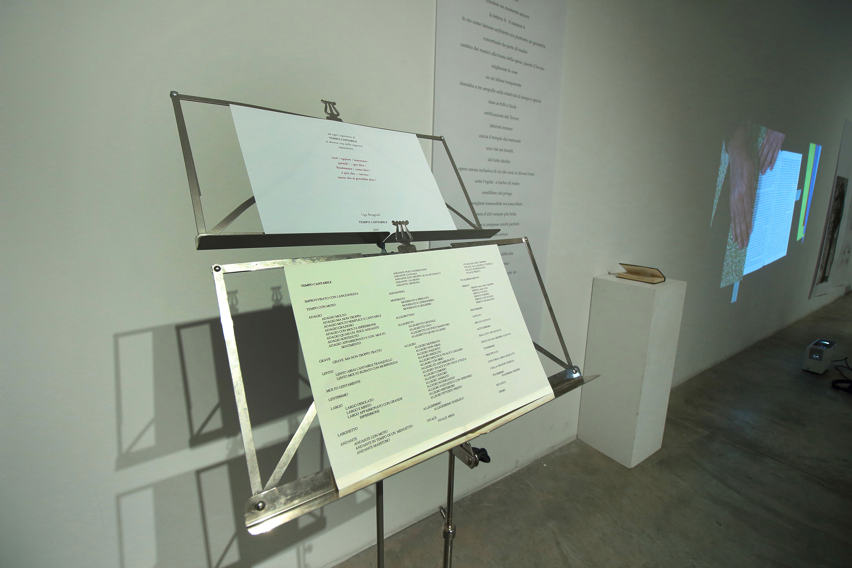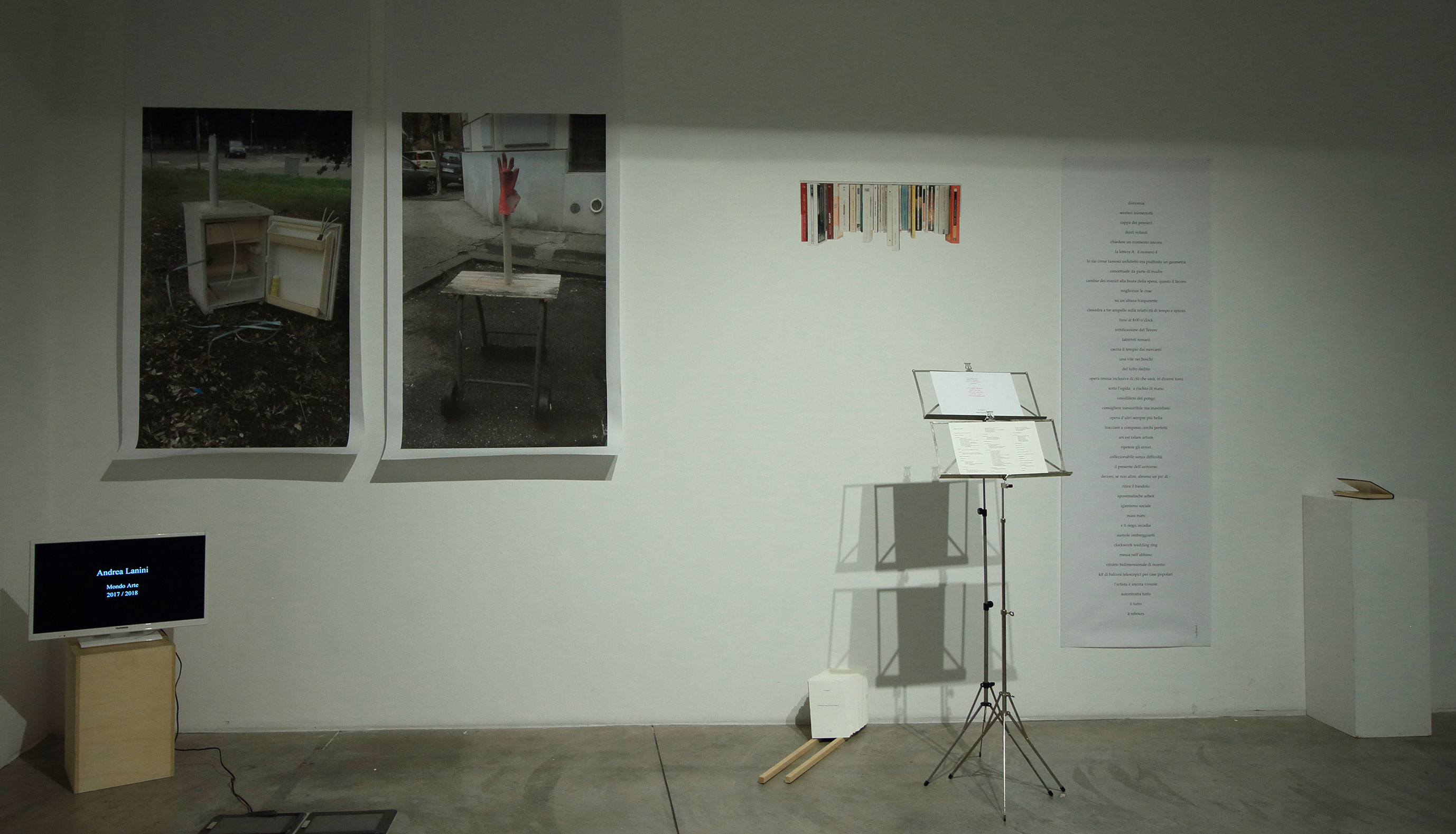 Installazioni e Altri materiali: (1) S. Bordini: Glimpsed, 2019, libro fotografico (2) S. Bordini: Noi bambini, ingrandimento da negativo fotografico tratto dal libro dal libro Glimpsed, 2019 (3) R. De Simone: Cerchiare l’infinito, 1993 (2007), video vhs pal a colori senza sonoro, trasferito su dvd nel 2007, video proiezione con descrizione dell’artista (4) L. Miti, Forse stanotte (operetta inutile), per Voce, Visitatore ed altro, 2011, installazione che precede alla messa in opera (5) M. Pieroni – D. Stiefelmeier, diapositive, documenti d’archivio selezionati da D. Borromeo (6) F. Santoro: La voltapagine, 2018-2019, 7 audio-registrazioni vocali (7) U. Brugnoli: L’ultima giornata di Rosso Malpelo — Riproduzione delle novelle L’ultima giornata (dalla raccolta Per le vie, 1883) e di Rosso Malpelo (dalla raccolta Vita nei Campi, 1880) di Giovanni Verga, 2008, stampa digitale su carta (8) U. Brugnoli: à rebours, 2007, libro modificato (9) claudioadami: Uno dopo l’altro, 1977, sequenza fotografica, stampa fotografica analogica su alluminio (10) claudioadami: Non c’è nulla da esprimere…, 2019, inchiostro su carta (11) A. Lanini: Mondo Arte, 2017-2018, sequenza di 12 immagini, video (12) A. Lanini: Mondo Arte, stampa plotter su carta (13) R. Mandolini: Senza Titolo, 2017/2018/2019, tre cere (14) R. Mandolini: Senza Titolo, 2017, olio su carta (15) R. Mandolini: Senza Titolo, 2017, olio su carta (16) R. Mandolini: Entro un minuto, 2014, video (17) L. Miti in dialogo con P. Polidori: Istruzioni di comportamento, 2018, audio-registrazione (18) P. Polidori: The (more than) 7 deadly sentences of Giuseppe Garrera’s book, 2018-2019, video (19) P. Polidori: La notizia della morte di Beckett, 2019, fotocopie “tazebao” del quotidiano “Libération”, Paris 27/12/89 (20) E. Rosato in dialogo con P. Polidori: Messaggio di forma che veniva da lontano, 2018, audio-registrazione (21) E. Rosato: Ritratto di Paolo (1963) e 6 disegni (1980), stampe su carta.