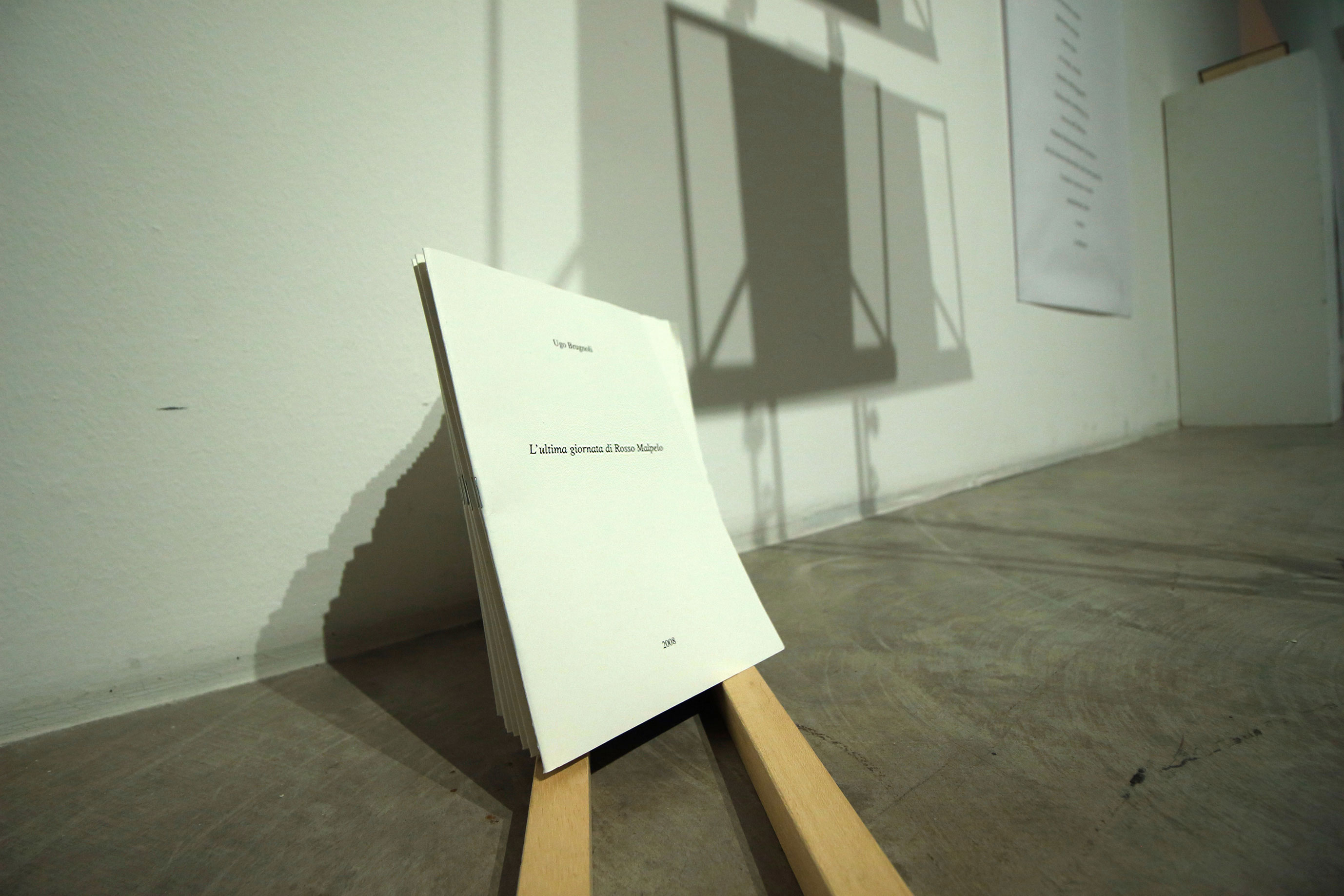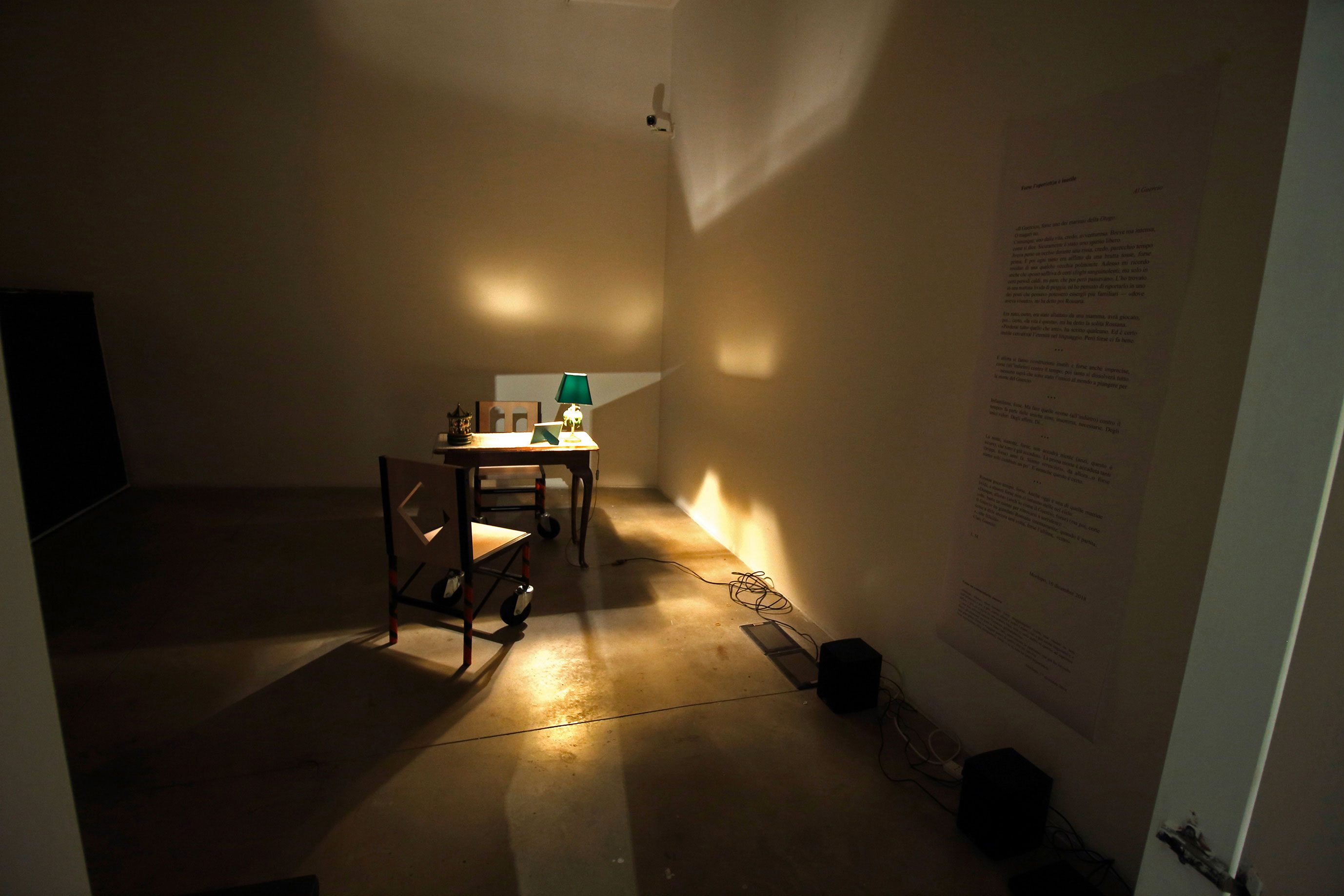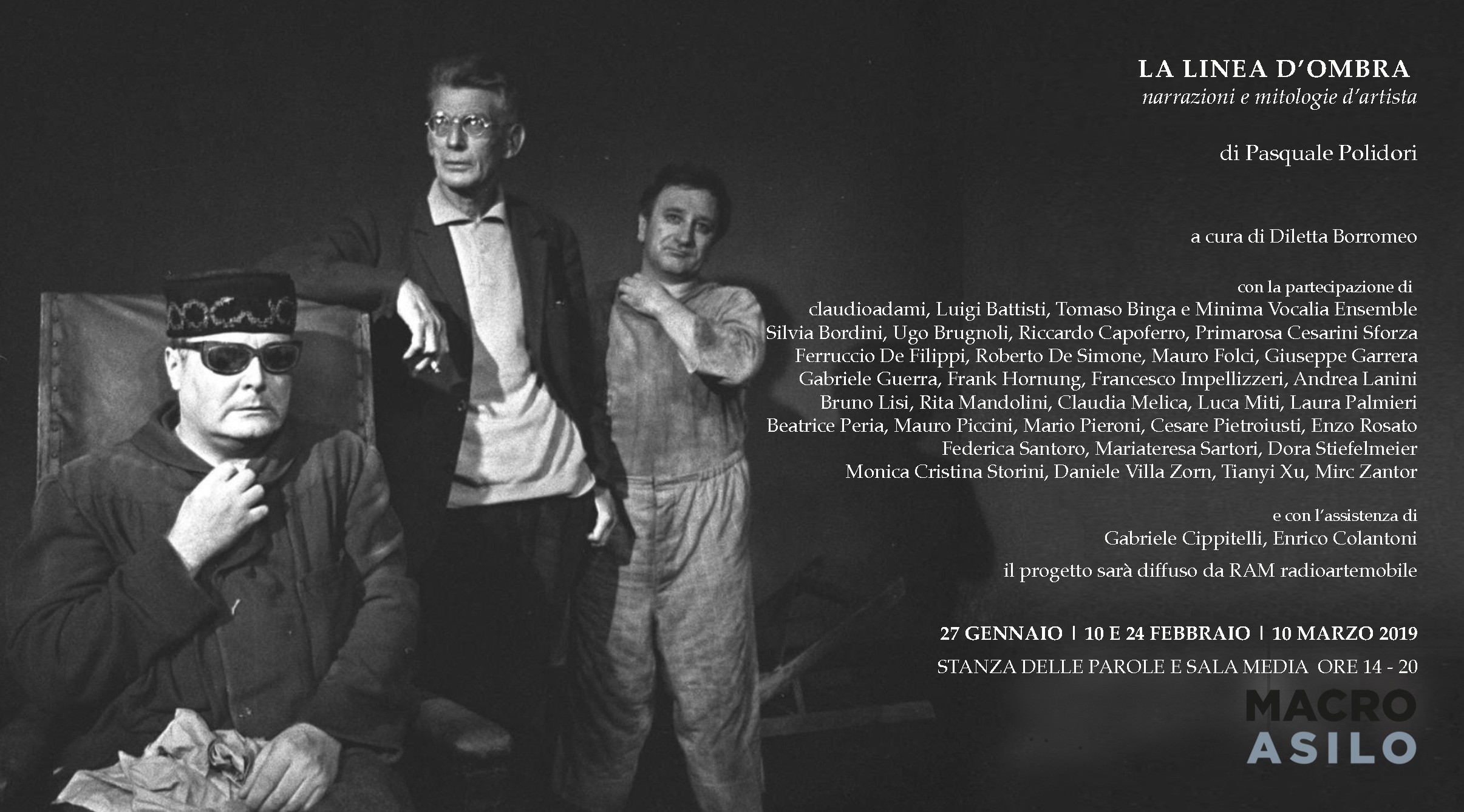 Installazioni e Altri materiali: (1) S. Bordini: Glimpsed, 2019, libro fotografico (2) S. Bordini: Noi bambini, ingrandimento da negativo fotografico tratto dal libro dal libro Glimpsed, 2019 (3) R. De Simone: Cerchiare l’infinito, 1993 (2007), video vhs pal a colori senza sonoro, trasferito su dvd nel 2007, video proiezione con descrizione dell’artista (4) L. Miti, Forse stanotte (operetta inutile), per Voce, Visitatore ed altro, 2011, installazione che precede alla messa in opera (5) M. Pieroni – D. Stiefelmeier, diapositive, documenti d’archivio selezionati da D. Borromeo (6) F. Santoro: La voltapagine, 2018-2019, 7 audio-registrazioni vocali (7) U. Brugnoli: L’ultima giornata di Rosso Malpelo — Riproduzione delle novelle L’ultima giornata (dalla raccolta Per le vie, 1883) e di Rosso Malpelo (dalla raccolta Vita nei Campi, 1880) di Giovanni Verga, 2008, stampa digitale su carta (8) U. Brugnoli: à rebours, 2007, libro modificato (9) claudioadami: Uno dopo l’altro, 1977, sequenza fotografica, stampa fotografica analogica su alluminio (10) claudioadami: Non c’è nulla da esprimere…, 2019, inchiostro su carta (11) A. Lanini: Mondo Arte, 2017-2018, sequenza di 12 immagini, video (12) A. Lanini: Mondo Arte, stampa plotter su carta (13) R. Mandolini: Senza Titolo, 2017/2018/2019, tre cere (14) R. Mandolini: Senza Titolo, 2017, olio su carta (15) R. Mandolini: Senza Titolo, 2017, olio su carta (16) R. Mandolini: Entro un minuto, 2014, video (17) L. Miti in dialogo con P. Polidori: Istruzioni di comportamento, 2018, audio-registrazione (18) P. Polidori: The (more than) 7 deadly sentences of Giuseppe Garrera’s book, 2018-2019, video (19) P. Polidori: La notizia della morte di Beckett, 2019, fotocopie “tazebao” del quotidiano “Libération”, Paris 27/12/89 (20) E. Rosato in dialogo con P. Polidori: Messaggio di forma che veniva da lontano, 2018, audio-registrazione (21) E. Rosato: Ritratto di Paolo (1963) e 6 disegni (1980), stampe su carta.