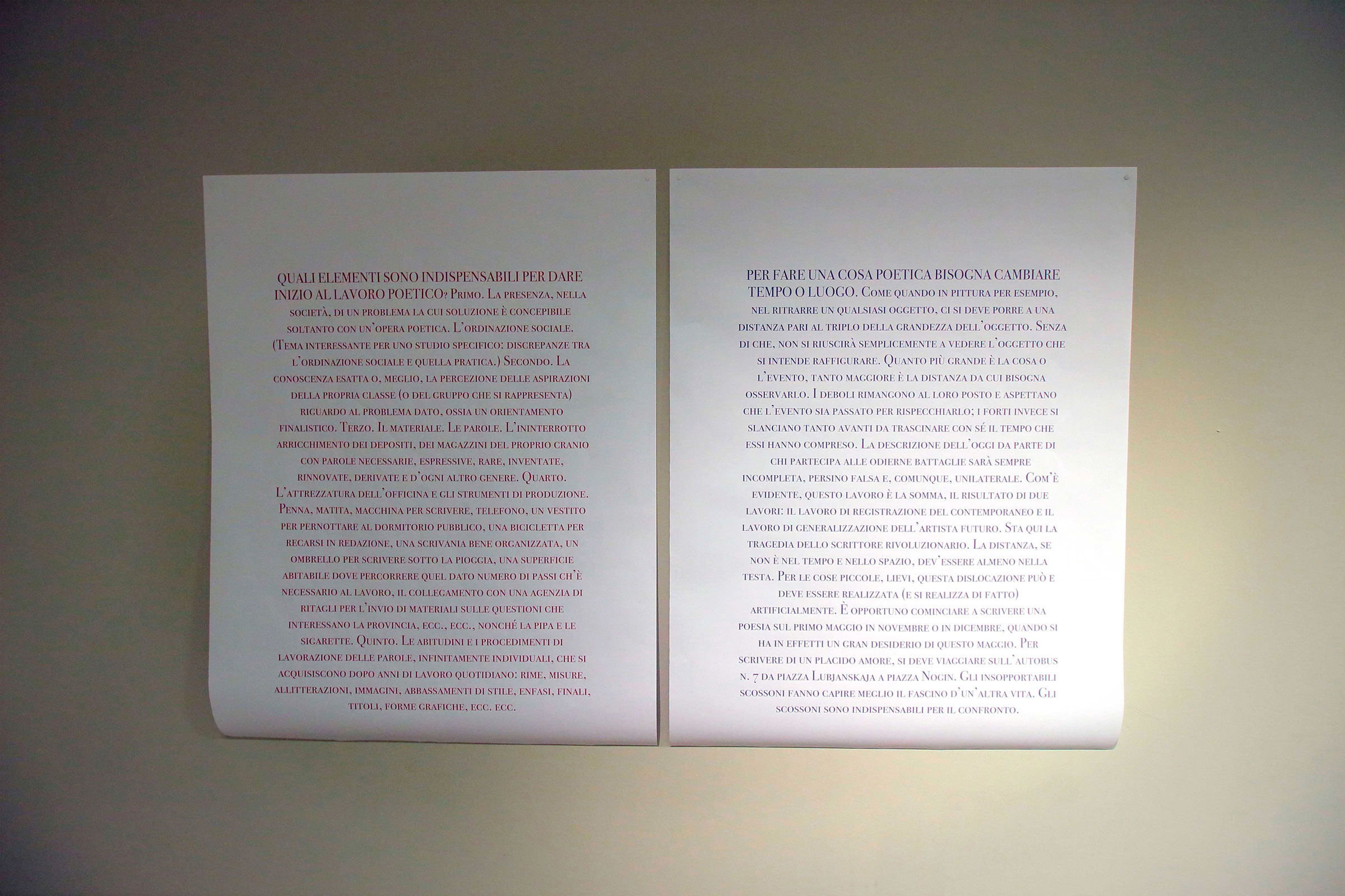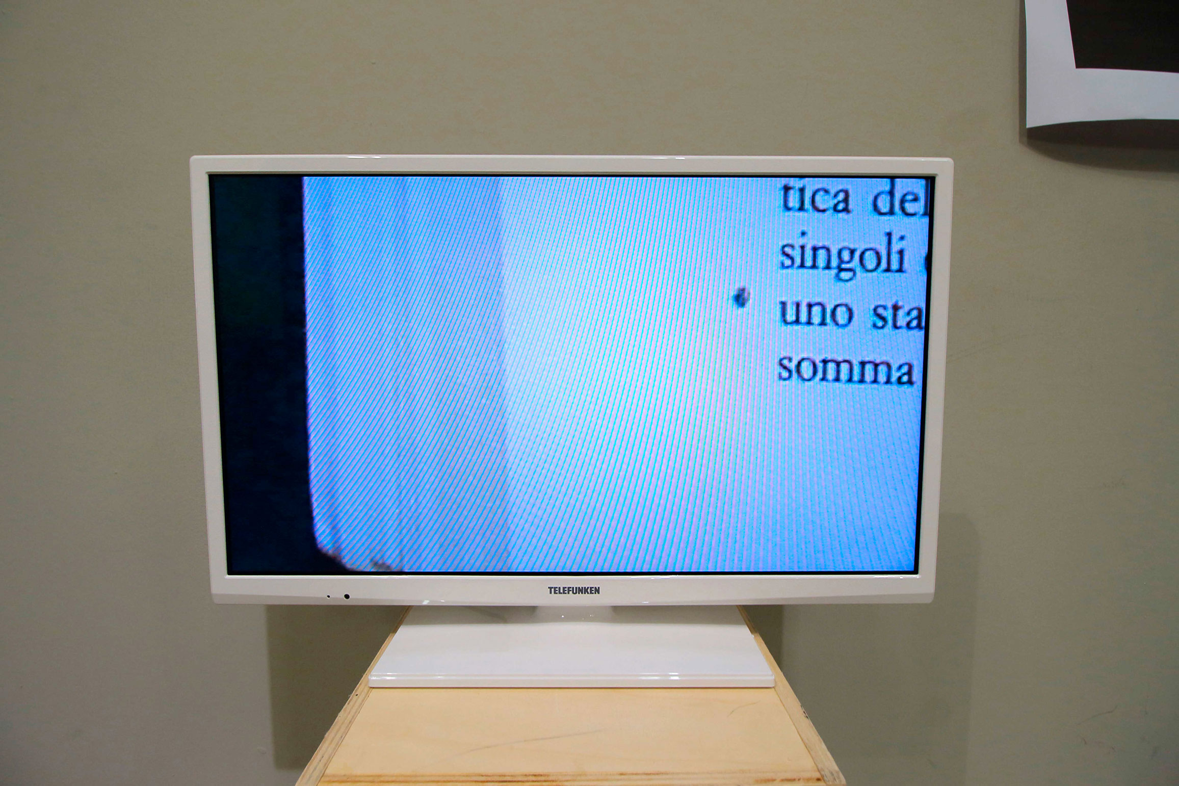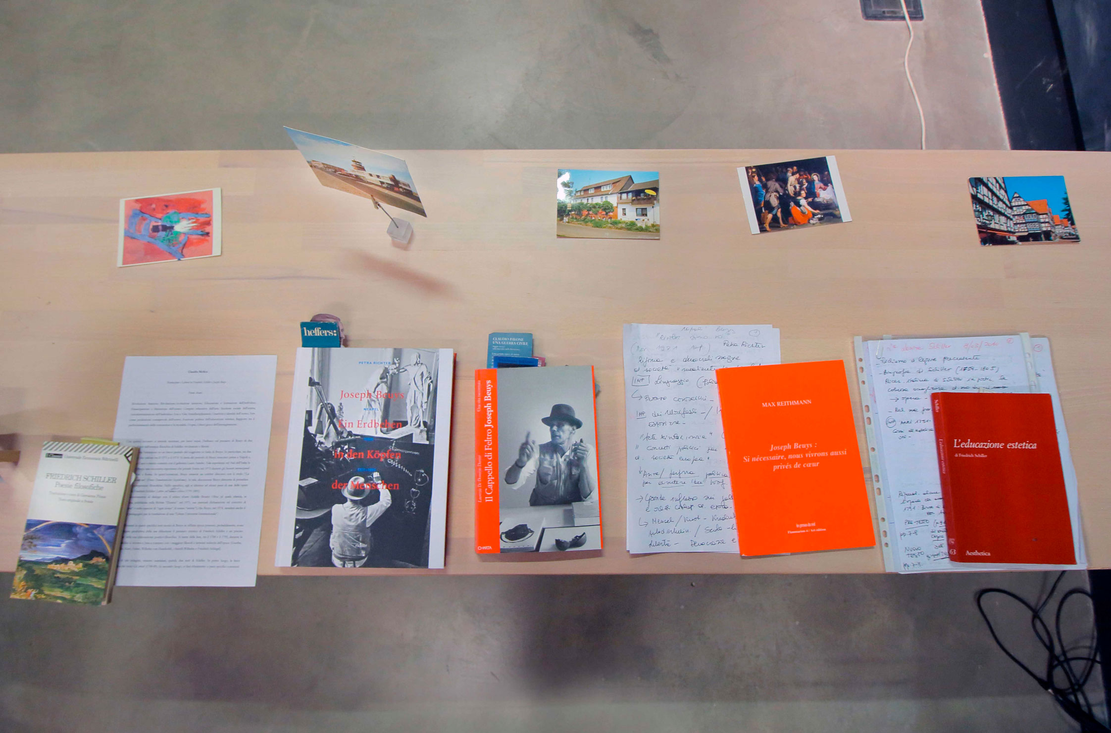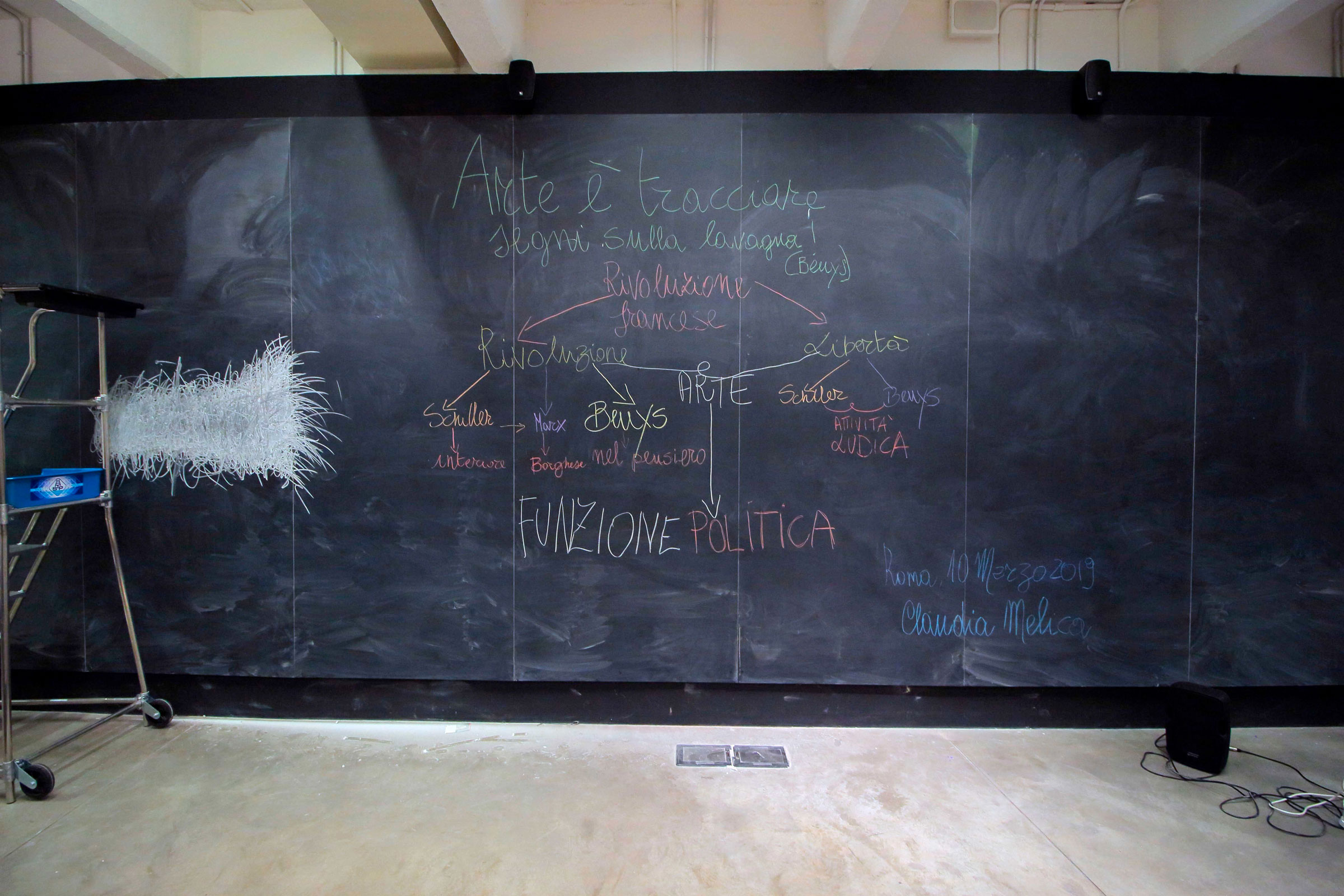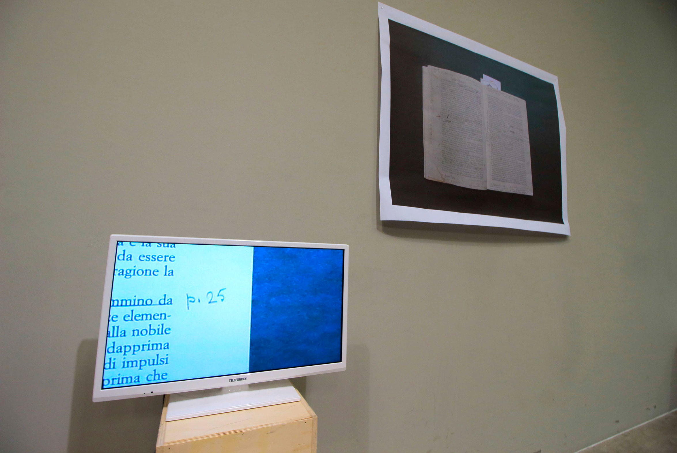 Installazioni e Altri materiali: (1) claudioadami: qual è la parola, 2015, programma sviluppato per scheda raspberry, proiezione (2) P. Cesarini Sforza: Senza titolo, 2018, lastra di piombo su tavola (3) P. Cesarini Sforza: Album, 2019, tecnica mista su album fotografico (4) Claudia Melica e Tianyi Xu: Matita su Schiller, 2019, video, montaggio di fotografie delle pagine del libro L’educazione estetica di Friedrich Schiller sottolineate e annotate a matita da Claudia Melica (5) R. De Simone: Intervallo, 2004, ingrandimento fotografico (6) M. Pieroni – D. Stiefelmeier: documenti d’archivio selezionati da D. Borromeo (7) P. Polidori: Due manifesti tratti da Majakovskij, 2018, stampa su carta (8) M. Zantor: Joseph Beuys is always looking at you, 2018, ingrandimento di fotogramma su carta (9) F. De Filippi: La strada del latte, 2019, video proiezione di una selezione di disegni dal 1974 al 1978 (10) F. De Filippi: Posta inviata nel 1973 agli artisti. (Con una risposta di Sandro Chia), 1973, tre ingrandimenti fotografici (11) M. Folci: Concerto transumante per flatus vocis, 2005, video, ingrandimenti di fotogrammi, testo stampato (12) P. Polidori: Prove di trazione, 2018, tre video documentazioni di azioni operate su tre volumi: Charles Batteux, Le Belle Arti ricondotte ad un unico principio, Bologna 1983; Max Horkheimer e Theodor Adorno, Dialettica dell’illuminismo, Torino 1966; Martin Heidegger, Sentieri interrotti, Firenze 1984 (13) P. Polidori: Non è Andy Warhol il vero scandalo, pagina de L’Unità dell’11 maggio 1977, ingrandimento fotografico + Didascalia di Andy Warhol, Oxidation Painting 1978 dal Museo Brandhorst di Monaco di Baviera, ingrandimento fotografico (14) F. Santoro: La voltapagine, 2018-2019, 8 audio-registrazioni vocali: Immobile (Beckett); I cinque secondi di Beckett; Inizio de La linea; L’educazione sentimentale Volume 1; L’educazione sentimentale Volume 2 (breve); L’educazione sentimentale Volume 2; Uno a cento; L’ultima pagina di Altrove di Michaux (15) F. Santoro: Trascrizione dell’Educazione sentimentale, 2019, stampa su carta (16) D. Villa Zorn: 7 collage: On the brink of…, 2015; Temptation of Dictatorship, 2012; The narrow path, 2013; Shipwreck, 2012; Revelation, 2018; The Cannibal Rome Epiphany, 2013; com’è difficile tornare a casa, 2014; ingrandimenti fotografici.
