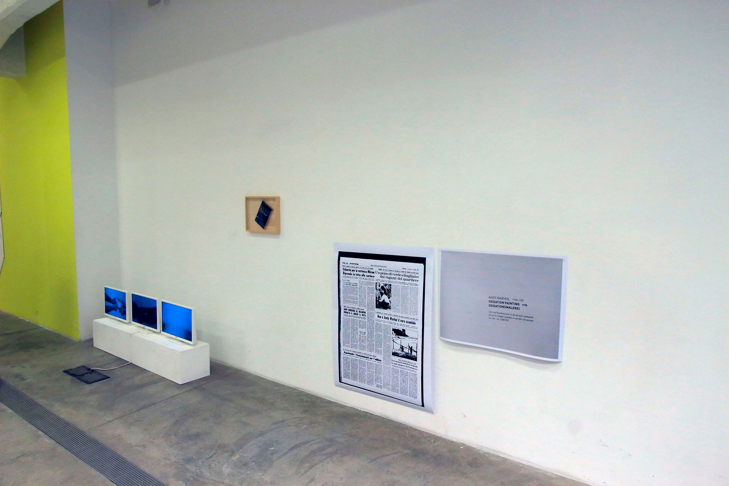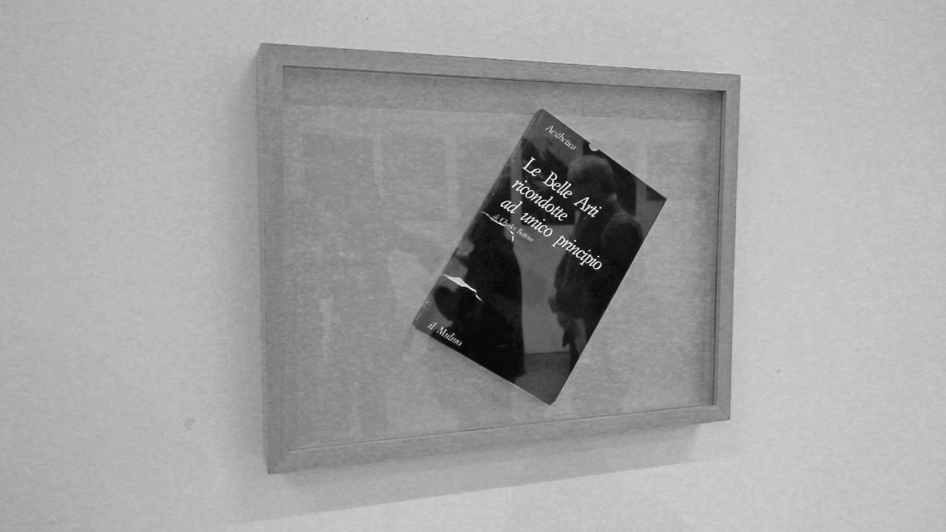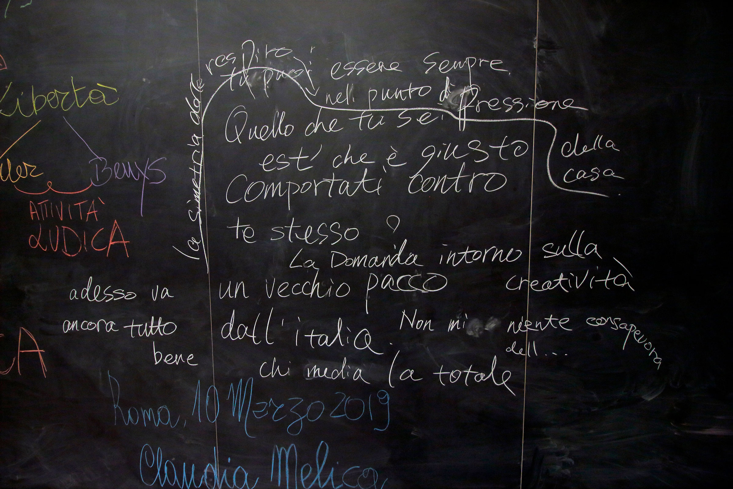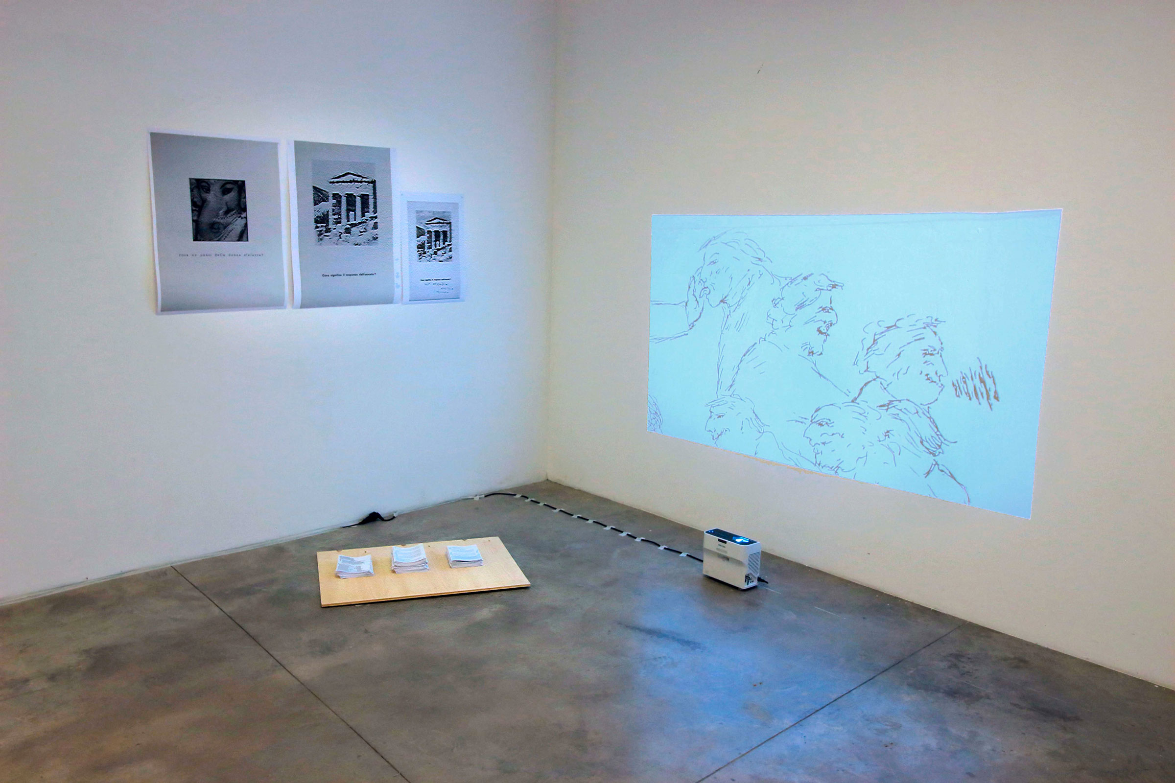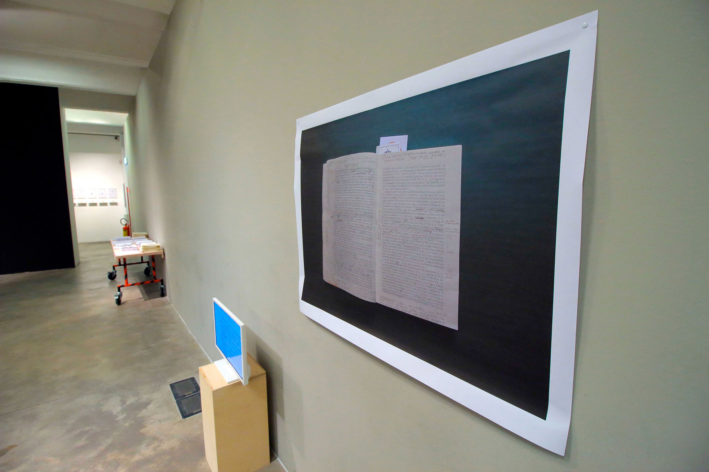 Installazioni e Altri materiali: (1) claudioadami: qual è la parola, 2015, programma sviluppato per scheda raspberry, proiezione (2) P. Cesarini Sforza: Senza titolo, 2018, lastra di piombo su tavola (3) P. Cesarini Sforza: Album, 2019, tecnica mista su album fotografico (4) Claudia Melica e Tianyi Xu: Matita su Schiller, 2019, video, montaggio di fotografie delle pagine del libro L’educazione estetica di Friedrich Schiller sottolineate e annotate a matita da Claudia Melica (5) R. De Simone: Intervallo, 2004, ingrandimento fotografico (6) M. Pieroni – D. Stiefelmeier: documenti d’archivio selezionati da D. Borromeo (7) P. Polidori: Due manifesti tratti da Majakovskij, 2018, stampa su carta (8) M. Zantor: Joseph Beuys is always looking at you, 2018, ingrandimento di fotogramma su carta (9) F. De Filippi: La strada del latte, 2019, video proiezione di una selezione di disegni dal 1974 al 1978 (10) F. De Filippi: Posta inviata nel 1973 agli artisti. (Con una risposta di Sandro Chia), 1973, tre ingrandimenti fotografici (11) M. Folci: Concerto transumante per flatus vocis, 2005, video, ingrandimenti di fotogrammi, testo stampato (12) P. Polidori: Prove di trazione, 2018, tre video documentazioni di azioni operate su tre volumi: Charles Batteux, Le Belle Arti ricondotte ad un unico principio, Bologna 1983; Max Horkheimer e Theodor Adorno, Dialettica dell’illuminismo, Torino 1966; Martin Heidegger, Sentieri interrotti, Firenze 1984 (13) P. Polidori: Non è Andy Warhol il vero scandalo, pagina de L’Unità dell’11 maggio 1977, ingrandimento fotografico + Didascalia di Andy Warhol, Oxidation Painting 1978 dal Museo Brandhorst di Monaco di Baviera, ingrandimento fotografico (14) F. Santoro: La voltapagine, 2018-2019, 8 audio-registrazioni vocali: Immobile (Beckett); I cinque secondi di Beckett; Inizio de La linea; L’educazione sentimentale Volume 1; L’educazione sentimentale Volume 2 (breve); L’educazione sentimentale Volume 2; Uno a cento; L’ultima pagina di Altrove di Michaux (15) F. Santoro: Trascrizione dell’Educazione sentimentale, 2019, stampa su carta (16) D. Villa Zorn: 7 collage: On the brink of…, 2015; Temptation of Dictatorship, 2012; The narrow path, 2013; Shipwreck, 2012; Revelation, 2018; The Cannibal Rome Epiphany, 2013; com’è difficile tornare a casa, 2014; ingrandimenti fotografici.