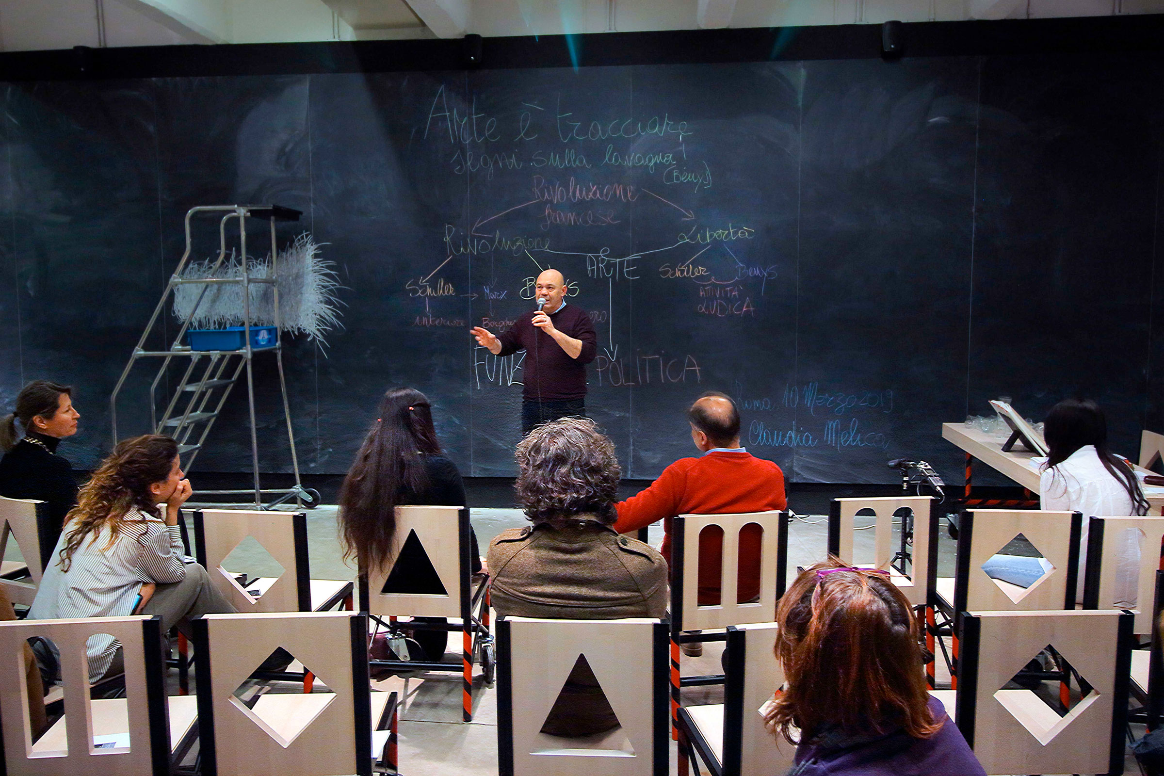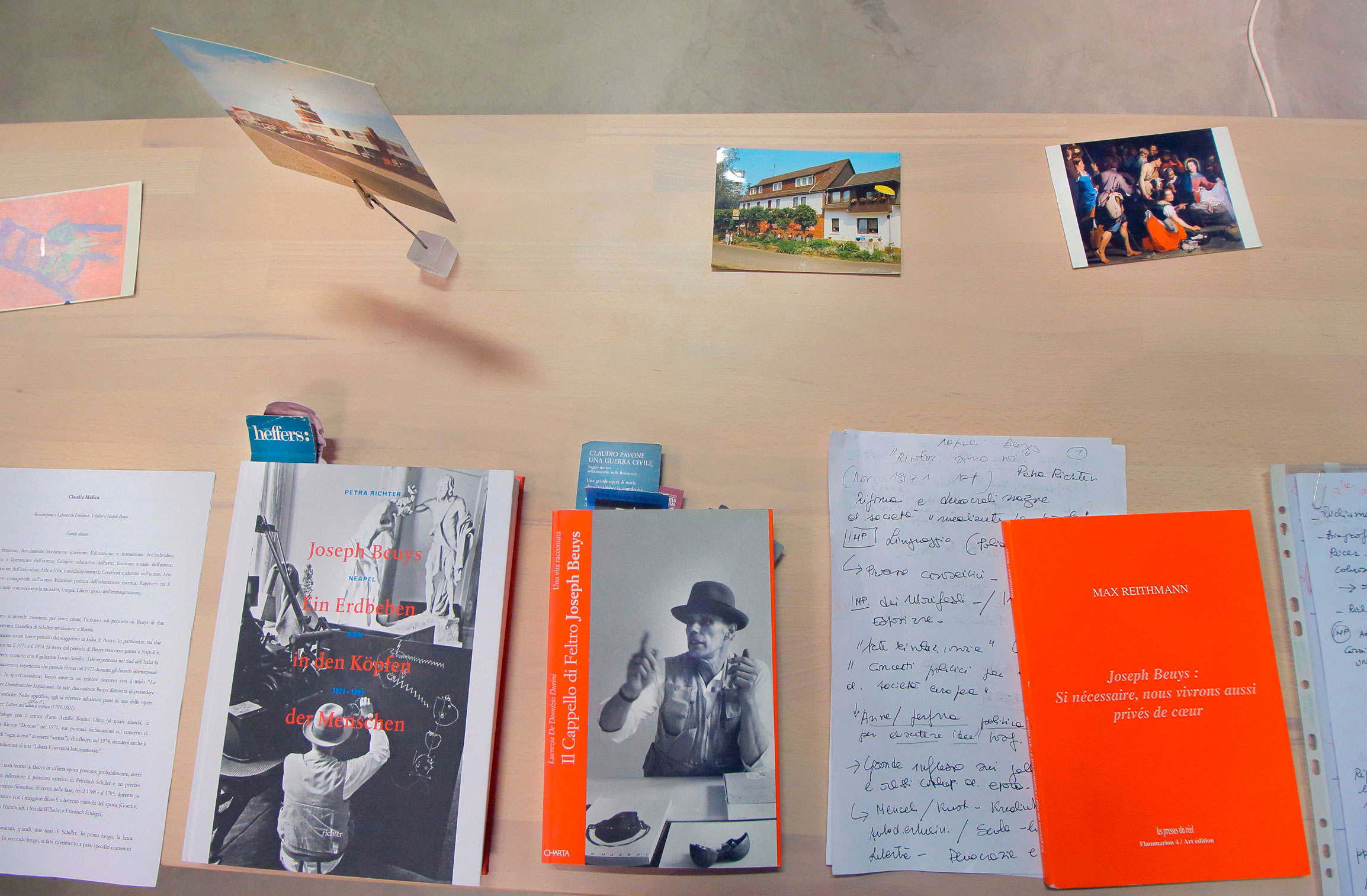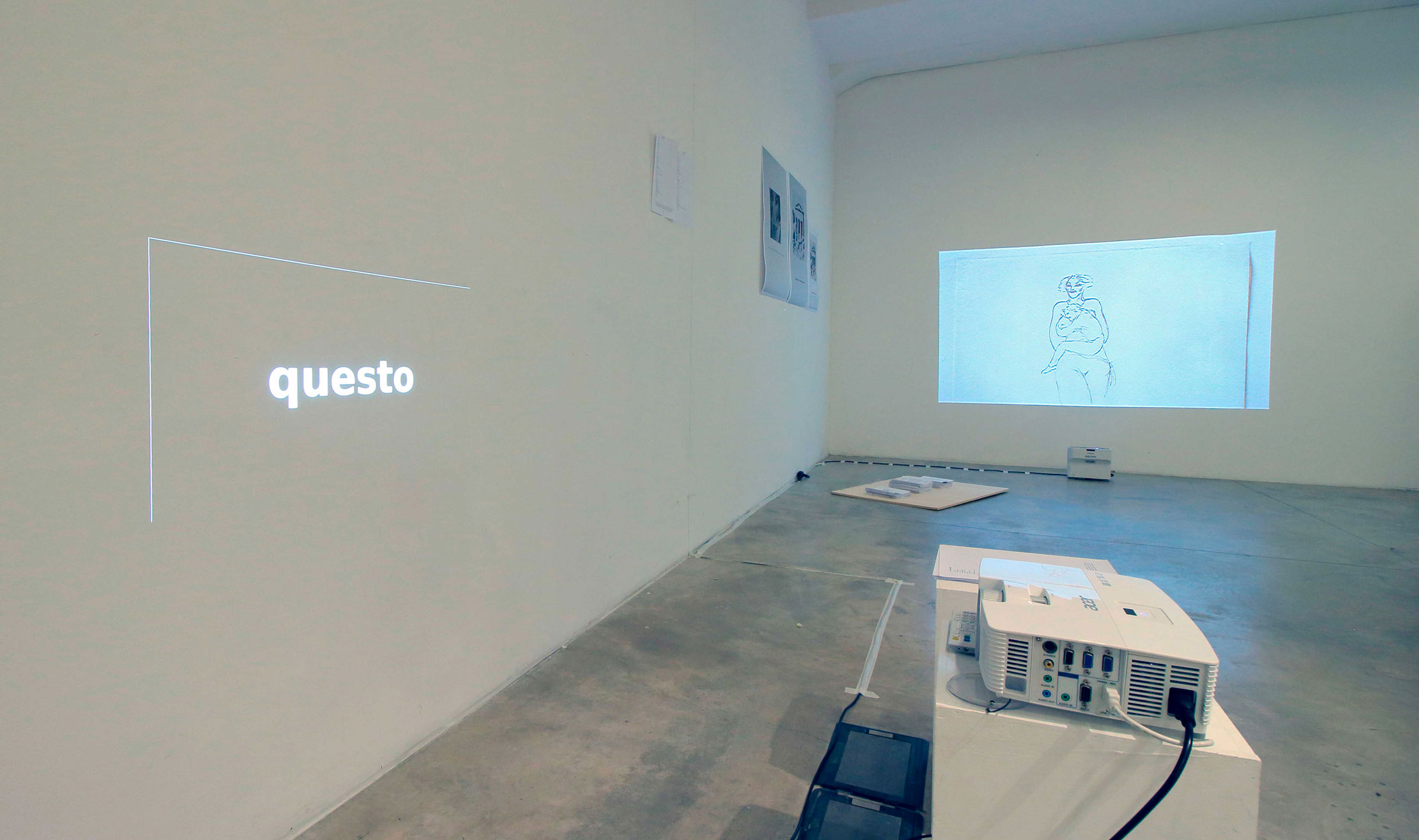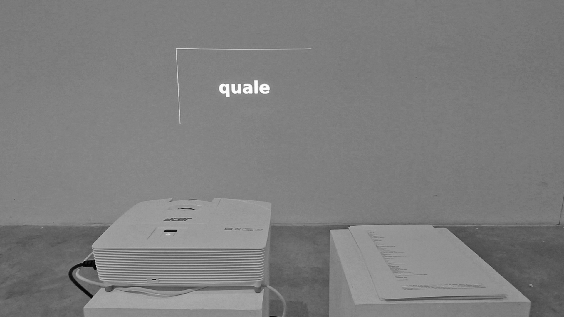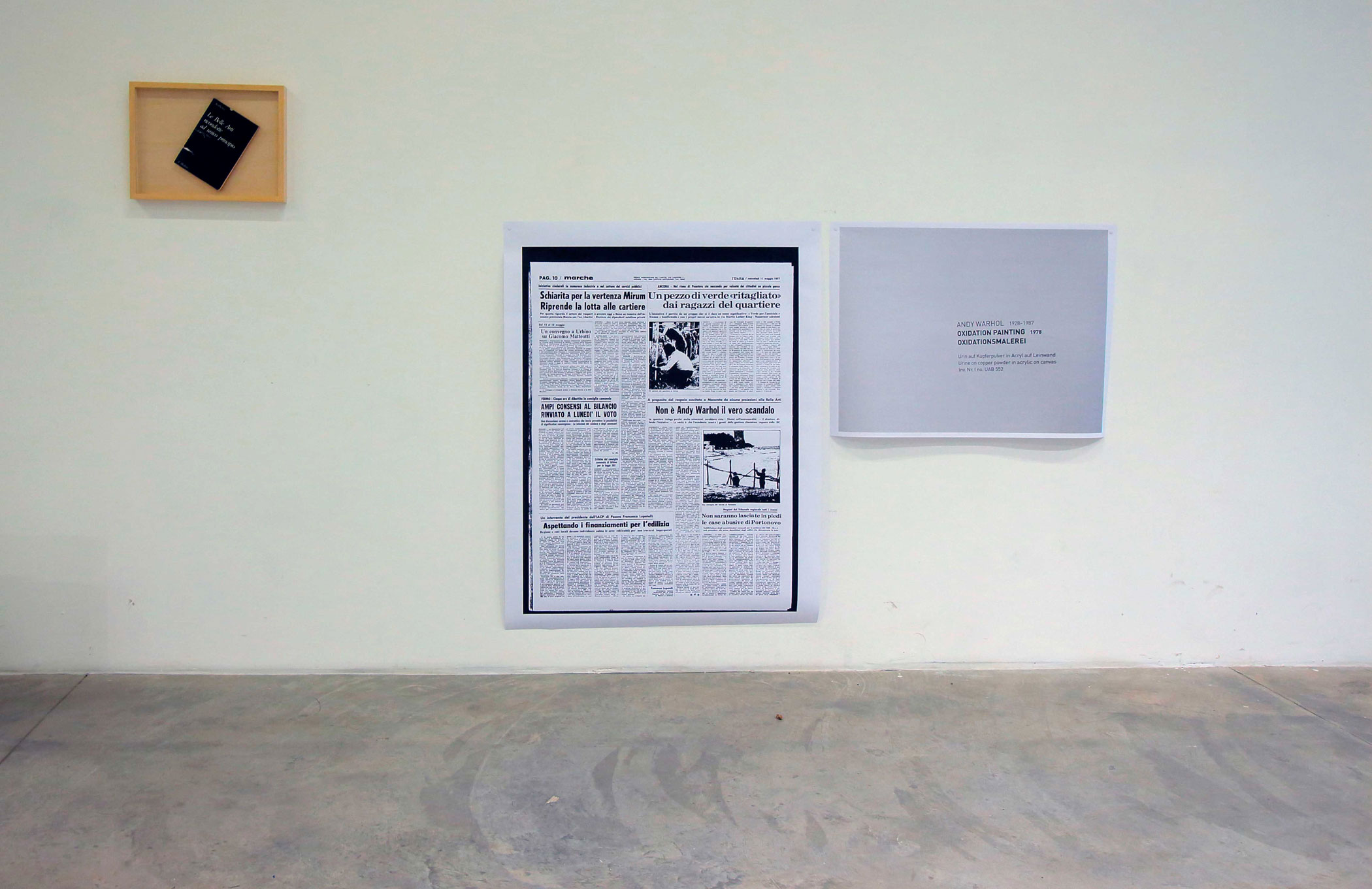 Installazioni e Altri materiali: (1) claudioadami: qual è la parola, 2015, programma sviluppato per scheda raspberry, proiezione (2) P. Cesarini Sforza: Senza titolo, 2018, lastra di piombo su tavola (3) P. Cesarini Sforza: Album, 2019, tecnica mista su album fotografico (4) Claudia Melica e Tianyi Xu: Matita su Schiller, 2019, video, montaggio di fotografie delle pagine del libro L’educazione estetica di Friedrich Schiller sottolineate e annotate a matita da Claudia Melica (5) R. De Simone: Intervallo, 2004, ingrandimento fotografico (6) M. Pieroni – D. Stiefelmeier: documenti d’archivio selezionati da D. Borromeo (7) P. Polidori: Due manifesti tratti da Majakovskij, 2018, stampa su carta (8) M. Zantor: Joseph Beuys is always looking at you, 2018, ingrandimento di fotogramma su carta (9) F. De Filippi: La strada del latte, 2019, video proiezione di una selezione di disegni dal 1974 al 1978 (10) F. De Filippi: Posta inviata nel 1973 agli artisti. (Con una risposta di Sandro Chia), 1973, tre ingrandimenti fotografici (11) M. Folci: Concerto transumante per flatus vocis, 2005, video, ingrandimenti di fotogrammi, testo stampato (12) P. Polidori: Prove di trazione, 2018, tre video documentazioni di azioni operate su tre volumi: Charles Batteux, Le Belle Arti ricondotte ad un unico principio, Bologna 1983; Max Horkheimer e Theodor Adorno, Dialettica dell’illuminismo, Torino 1966; Martin Heidegger, Sentieri interrotti, Firenze 1984 (13) P. Polidori: Non è Andy Warhol il vero scandalo, pagina de L’Unità dell’11 maggio 1977, ingrandimento fotografico + Didascalia di Andy Warhol, Oxidation Painting 1978 dal Museo Brandhorst di Monaco di Baviera, ingrandimento fotografico (14) F. Santoro: La voltapagine, 2018-2019, 8 audio-registrazioni vocali: Immobile (Beckett); I cinque secondi di Beckett; Inizio de La linea; L’educazione sentimentale Volume 1; L’educazione sentimentale Volume 2 (breve); L’educazione sentimentale Volume 2; Uno a cento; L’ultima pagina di Altrove di Michaux (15) F. Santoro: Trascrizione dell’Educazione sentimentale, 2019, stampa su carta (16) D. Villa Zorn: 7 collage: On the brink of…, 2015; Temptation of Dictatorship, 2012; The narrow path, 2013; Shipwreck, 2012; Revelation, 2018; The Cannibal Rome Epiphany, 2013; com’è difficile tornare a casa, 2014; ingrandimenti fotografici.