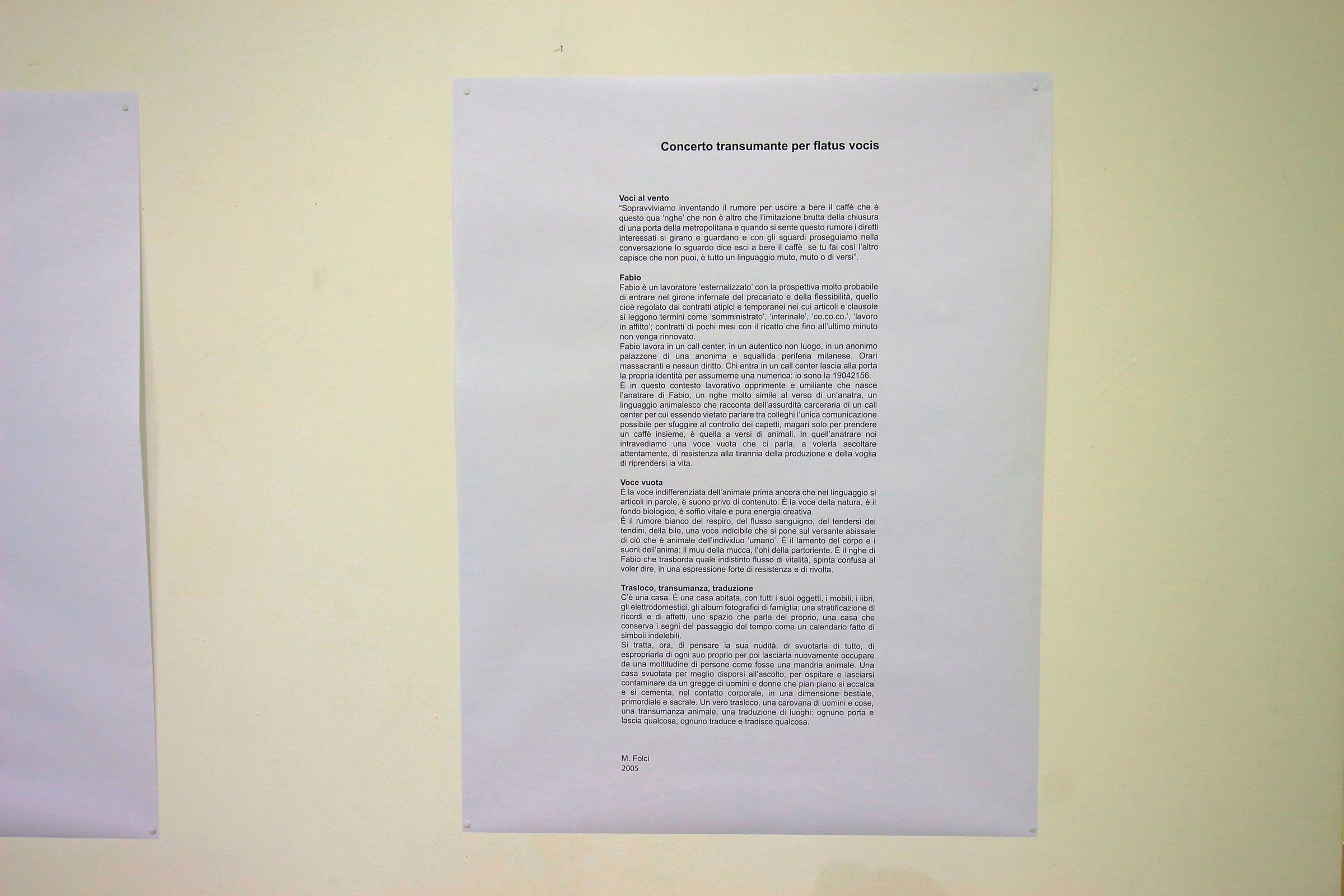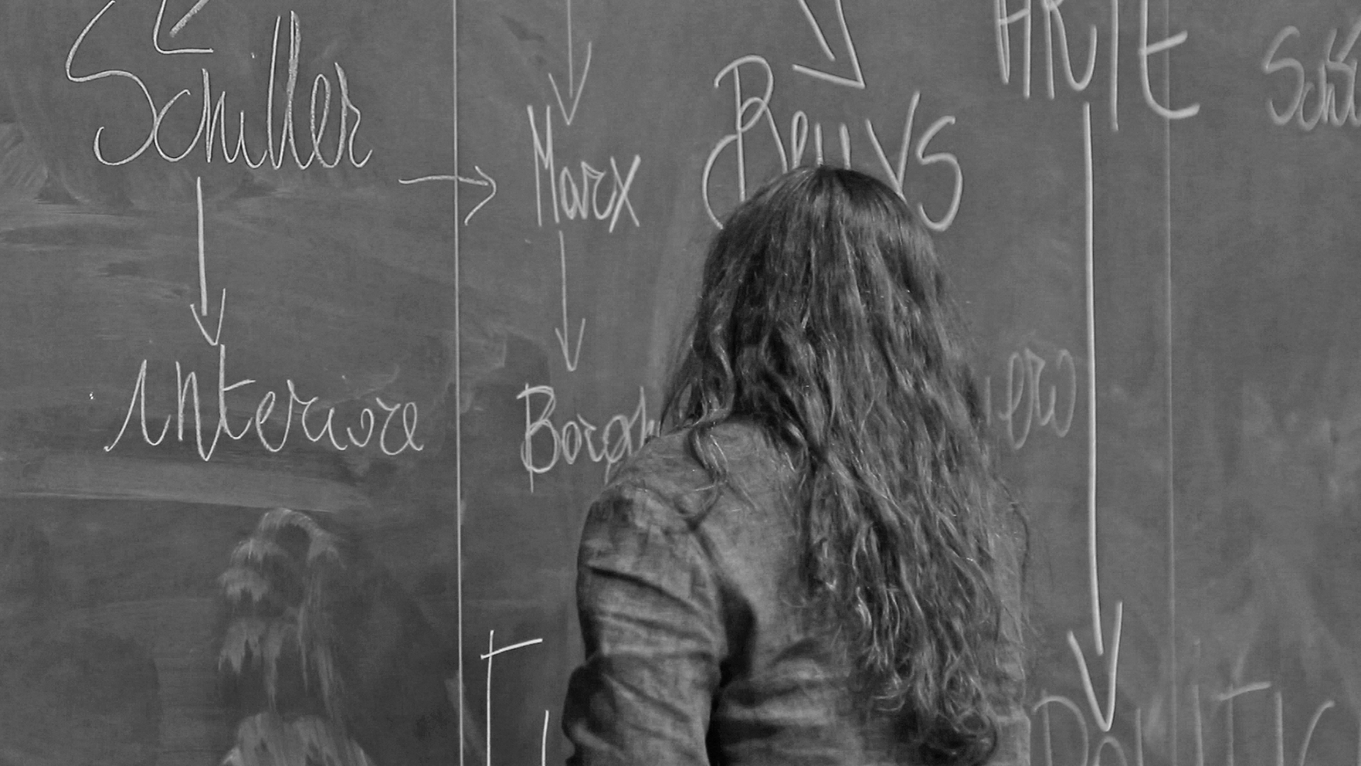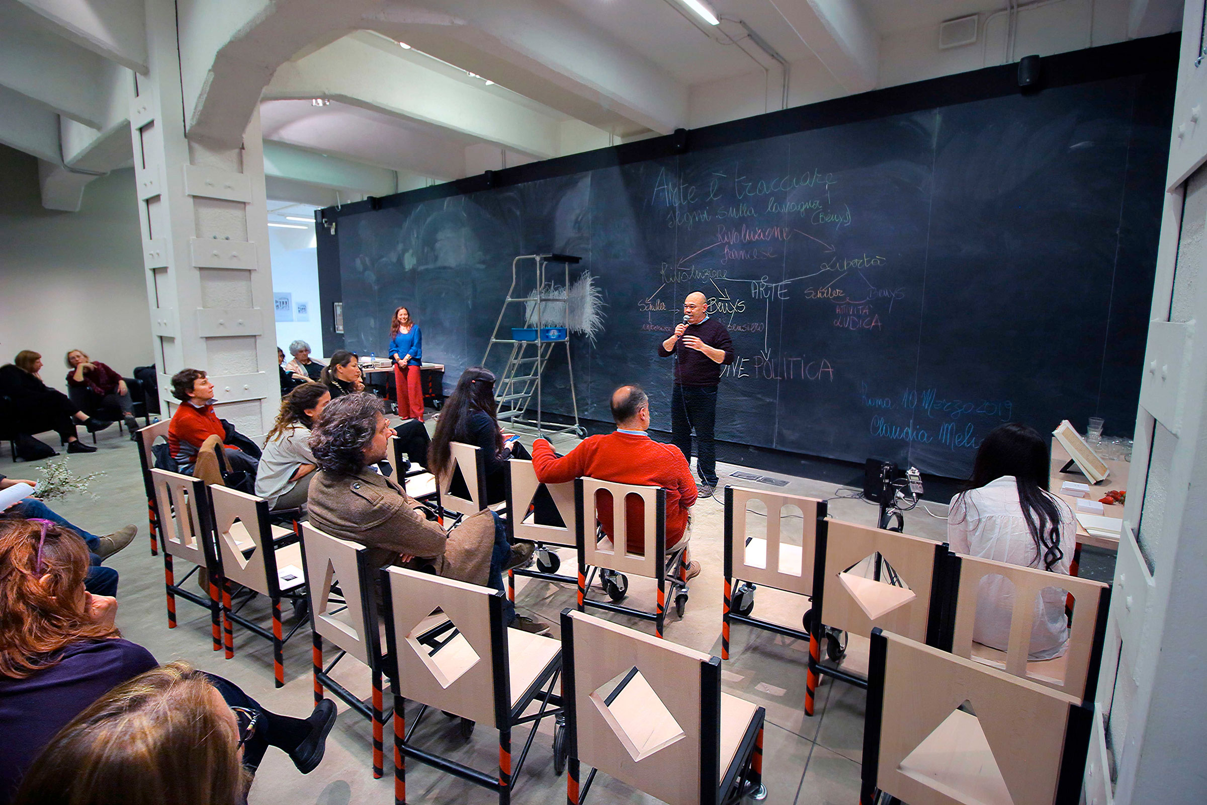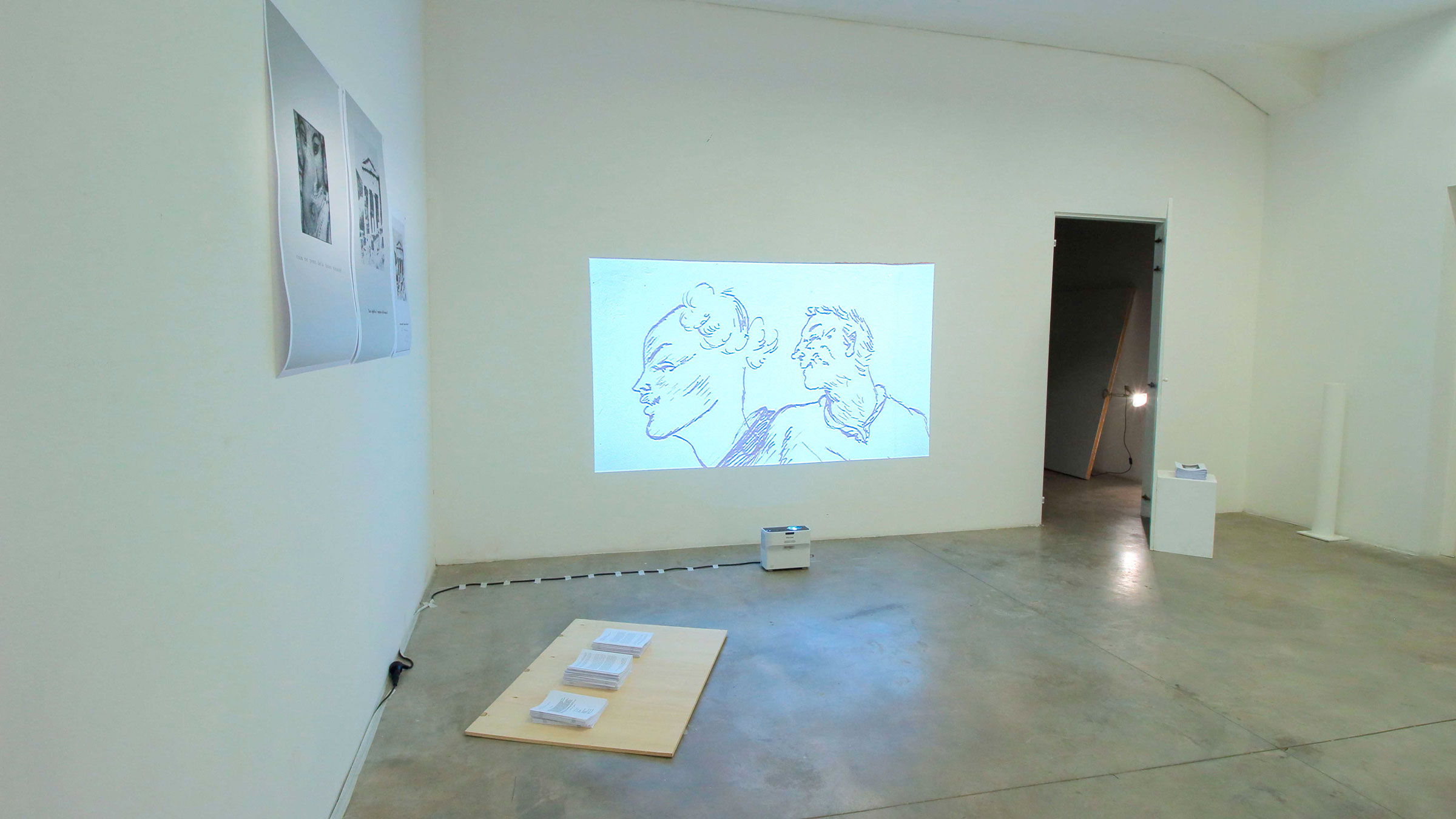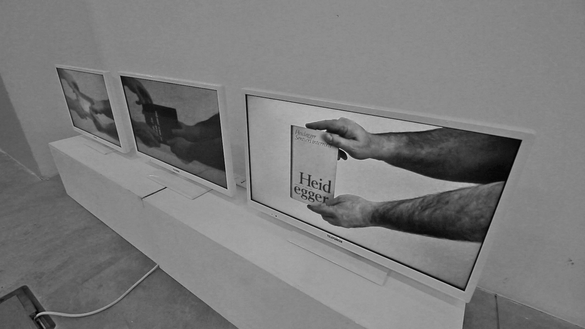 Installazioni e Altri materiali: (1) claudioadami: qual è la parola, 2015, programma sviluppato per scheda raspberry, proiezione (2) P. Cesarini Sforza: Senza titolo, 2018, lastra di piombo su tavola (3) P. Cesarini Sforza: Album, 2019, tecnica mista su album fotografico (4) Claudia Melica e Tianyi Xu: Matita su Schiller, 2019, video, montaggio di fotografie delle pagine del libro L’educazione estetica di Friedrich Schiller sottolineate e annotate a matita da Claudia Melica (5) R. De Simone: Intervallo, 2004, ingrandimento fotografico (6) M. Pieroni – D. Stiefelmeier: documenti d’archivio selezionati da D. Borromeo (7) P. Polidori: Due manifesti tratti da Majakovskij, 2018, stampa su carta (8) M. Zantor: Joseph Beuys is always looking at you, 2018, ingrandimento di fotogramma su carta (9) F. De Filippi: La strada del latte, 2019, video proiezione di una selezione di disegni dal 1974 al 1978 (10) F. De Filippi: Posta inviata nel 1973 agli artisti. (Con una risposta di Sandro Chia), 1973, tre ingrandimenti fotografici (11) M. Folci: Concerto transumante per flatus vocis, 2005, video, ingrandimenti di fotogrammi, testo stampato (12) P. Polidori: Prove di trazione, 2018, tre video documentazioni di azioni operate su tre volumi: Charles Batteux, Le Belle Arti ricondotte ad un unico principio, Bologna 1983; Max Horkheimer e Theodor Adorno, Dialettica dell’illuminismo, Torino 1966; Martin Heidegger, Sentieri interrotti, Firenze 1984 (13) P. Polidori: Non è Andy Warhol il vero scandalo, pagina de L’Unità dell’11 maggio 1977, ingrandimento fotografico + Didascalia di Andy Warhol, Oxidation Painting 1978 dal Museo Brandhorst di Monaco di Baviera, ingrandimento fotografico (14) F. Santoro: La voltapagine, 2018-2019, 8 audio-registrazioni vocali: Immobile (Beckett); I cinque secondi di Beckett; Inizio de La linea; L’educazione sentimentale Volume 1; L’educazione sentimentale Volume 2 (breve); L’educazione sentimentale Volume 2; Uno a cento; L’ultima pagina di Altrove di Michaux (15) F. Santoro: Trascrizione dell’Educazione sentimentale, 2019, stampa su carta (16) D. Villa Zorn: 7 collage: On the brink of…, 2015; Temptation of Dictatorship, 2012; The narrow path, 2013; Shipwreck, 2012; Revelation, 2018; The Cannibal Rome Epiphany, 2013; com’è difficile tornare a casa, 2014; ingrandimenti fotografici.