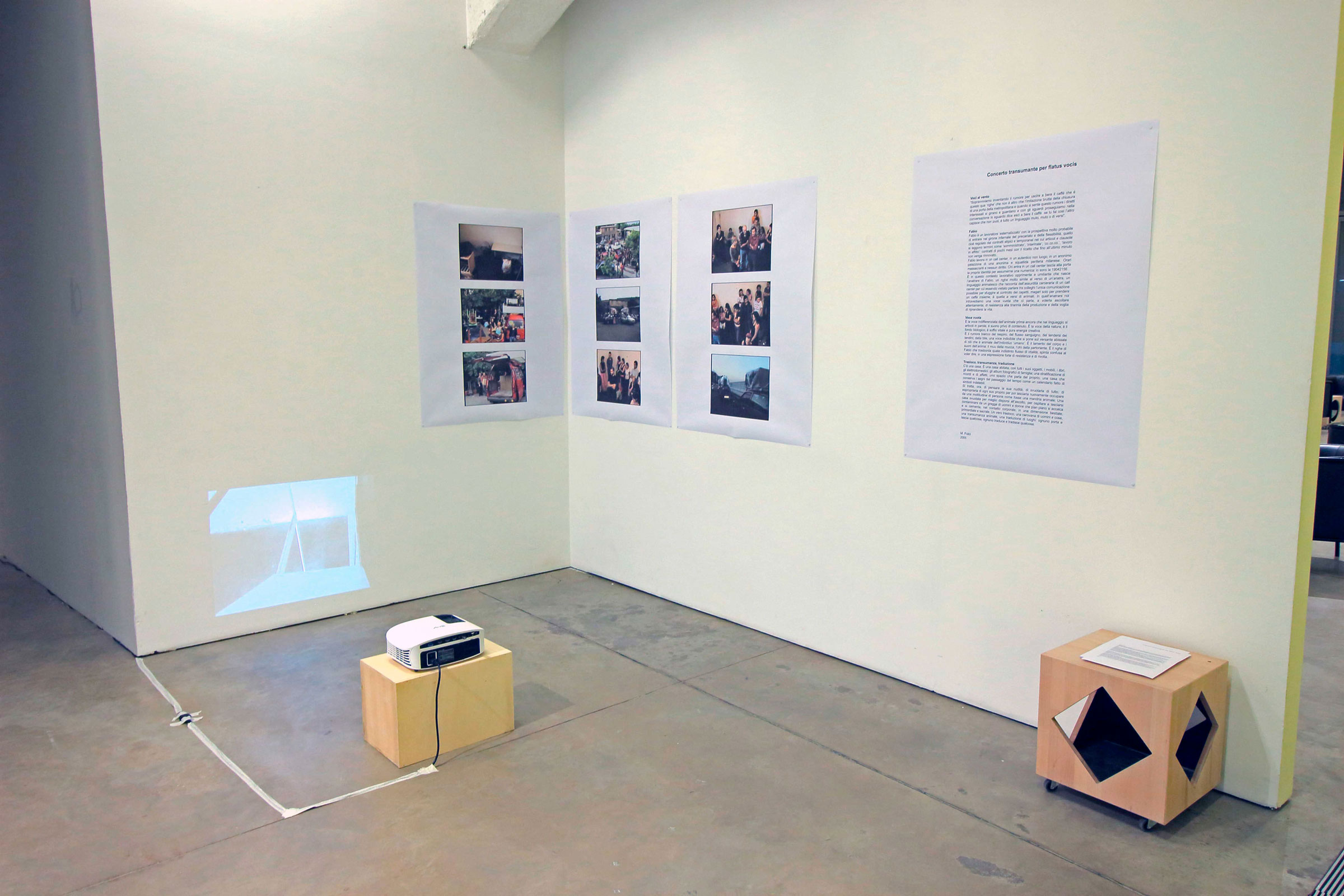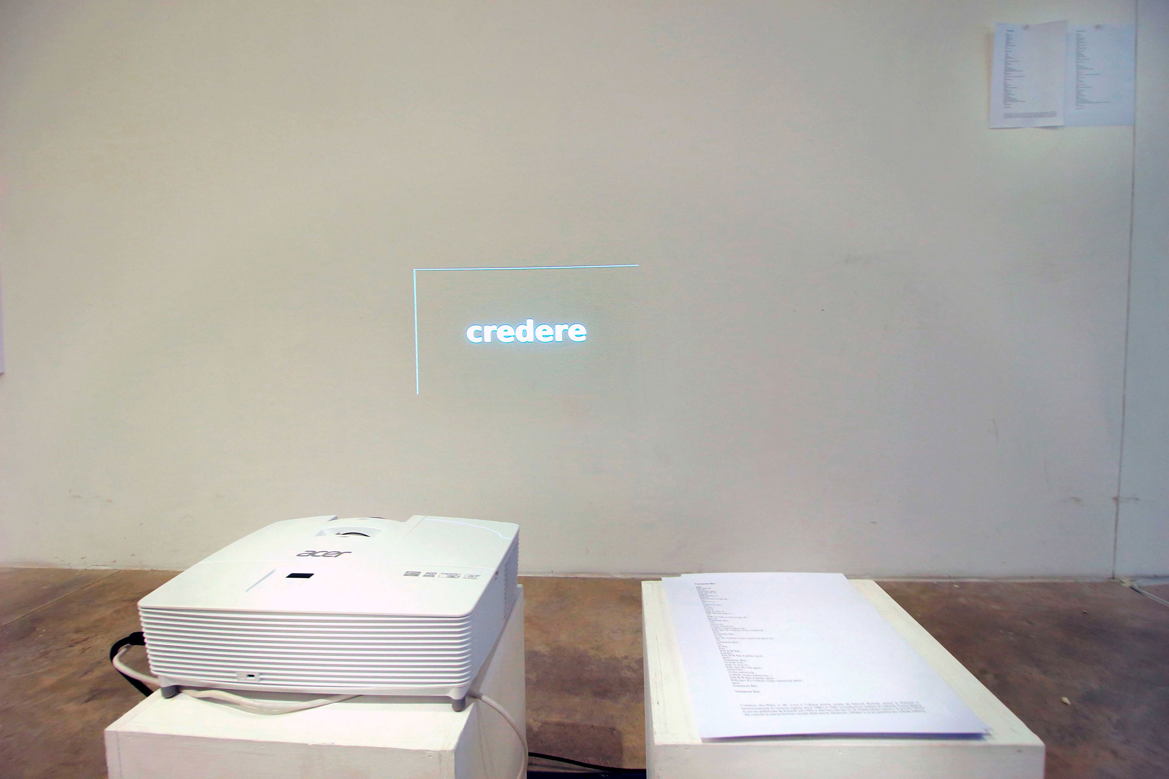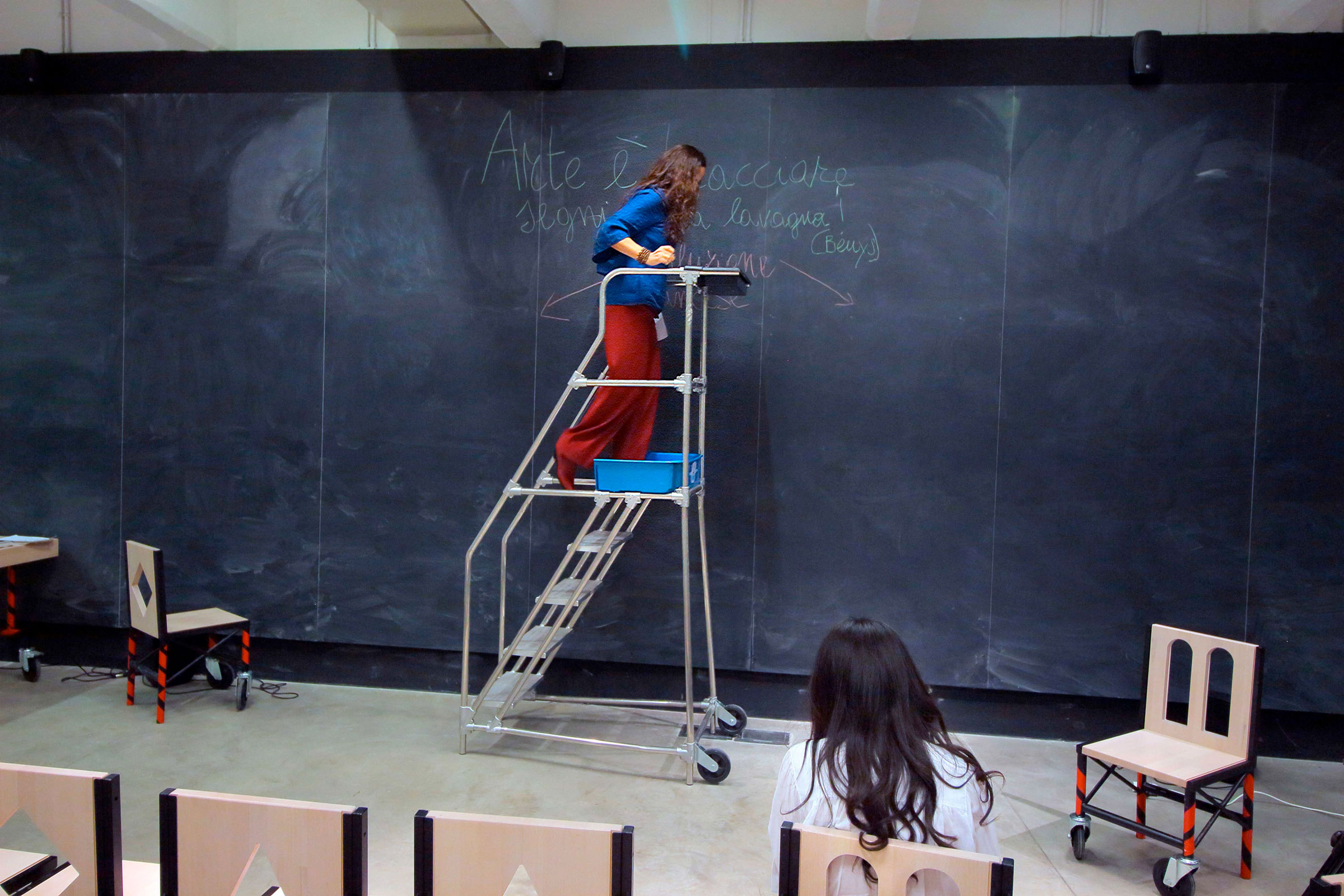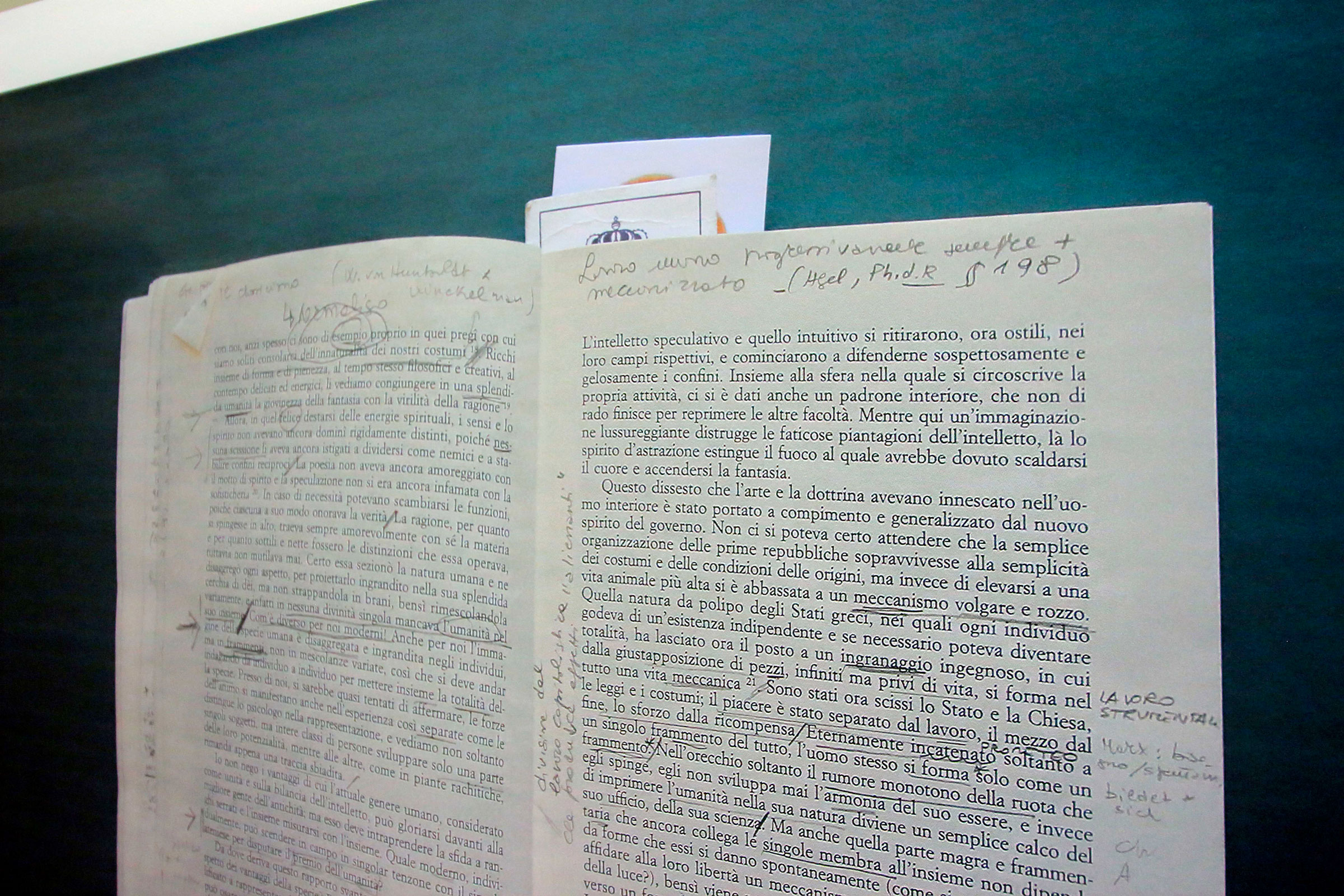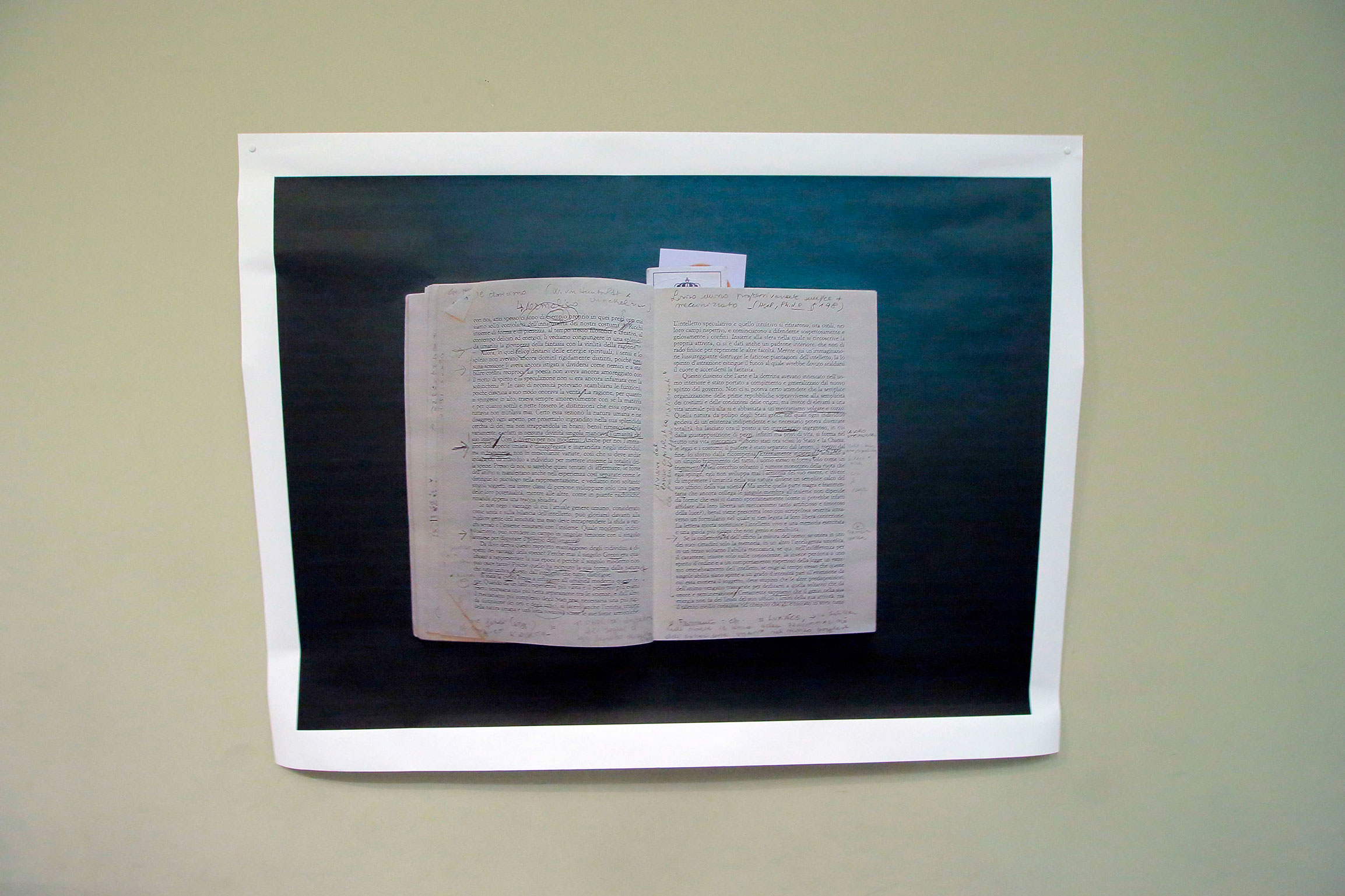 Installazioni e Altri materiali: (1) claudioadami: qual è la parola, 2015, programma sviluppato per scheda raspberry, proiezione (2) P. Cesarini Sforza: Senza titolo, 2018, lastra di piombo su tavola (3) P. Cesarini Sforza: Album, 2019, tecnica mista su album fotografico (4) Claudia Melica e Tianyi Xu: Matita su Schiller, 2019, video, montaggio di fotografie delle pagine del libro L’educazione estetica di Friedrich Schiller sottolineate e annotate a matita da Claudia Melica (5) R. De Simone: Intervallo, 2004, ingrandimento fotografico (6) M. Pieroni – D. Stiefelmeier: documenti d’archivio selezionati da D. Borromeo (7) P. Polidori: Due manifesti tratti da Majakovskij, 2018, stampa su carta (8) M. Zantor: Joseph Beuys is always looking at you, 2018, ingrandimento di fotogramma su carta (9) F. De Filippi: La strada del latte, 2019, video proiezione di una selezione di disegni dal 1974 al 1978 (10) F. De Filippi: Posta inviata nel 1973 agli artisti. (Con una risposta di Sandro Chia), 1973, tre ingrandimenti fotografici (11) M. Folci: Concerto transumante per flatus vocis, 2005, video, ingrandimenti di fotogrammi, testo stampato (12) P. Polidori: Prove di trazione, 2018, tre video documentazioni di azioni operate su tre volumi: Charles Batteux, Le Belle Arti ricondotte ad un unico principio, Bologna 1983; Max Horkheimer e Theodor Adorno, Dialettica dell’illuminismo, Torino 1966; Martin Heidegger, Sentieri interrotti, Firenze 1984 (13) P. Polidori: Non è Andy Warhol il vero scandalo, pagina de L’Unità dell’11 maggio 1977, ingrandimento fotografico + Didascalia di Andy Warhol, Oxidation Painting 1978 dal Museo Brandhorst di Monaco di Baviera, ingrandimento fotografico (14) F. Santoro: La voltapagine, 2018-2019, 8 audio-registrazioni vocali: Immobile (Beckett); I cinque secondi di Beckett; Inizio de La linea; L’educazione sentimentale Volume 1; L’educazione sentimentale Volume 2 (breve); L’educazione sentimentale Volume 2; Uno a cento; L’ultima pagina di Altrove di Michaux (15) F. Santoro: Trascrizione dell’Educazione sentimentale, 2019, stampa su carta (16) D. Villa Zorn: 7 collage: On the brink of…, 2015; Temptation of Dictatorship, 2012; The narrow path, 2013; Shipwreck, 2012; Revelation, 2018; The Cannibal Rome Epiphany, 2013; com’è difficile tornare a casa, 2014; ingrandimenti fotografici.