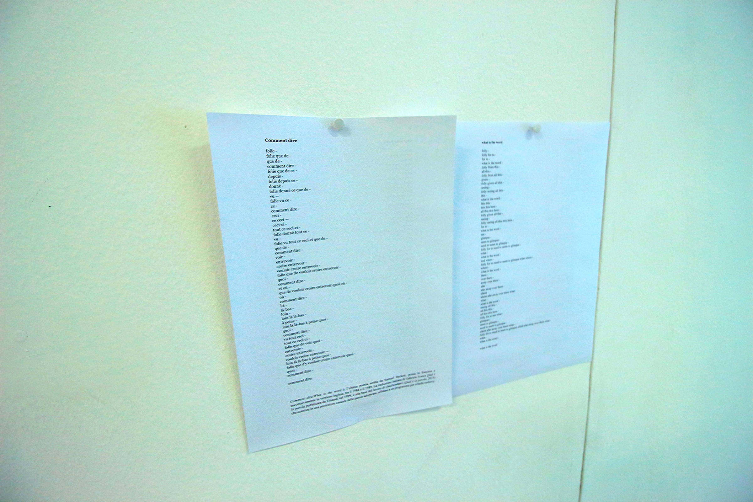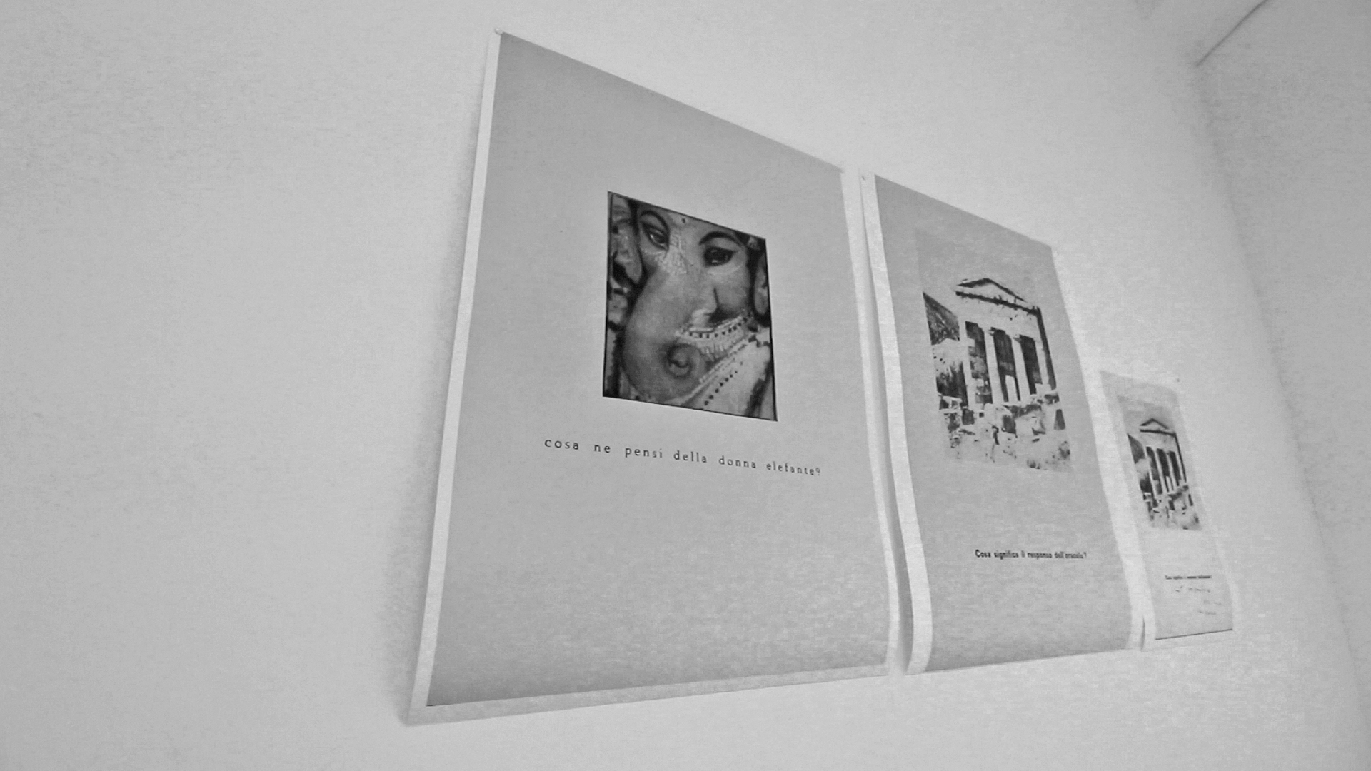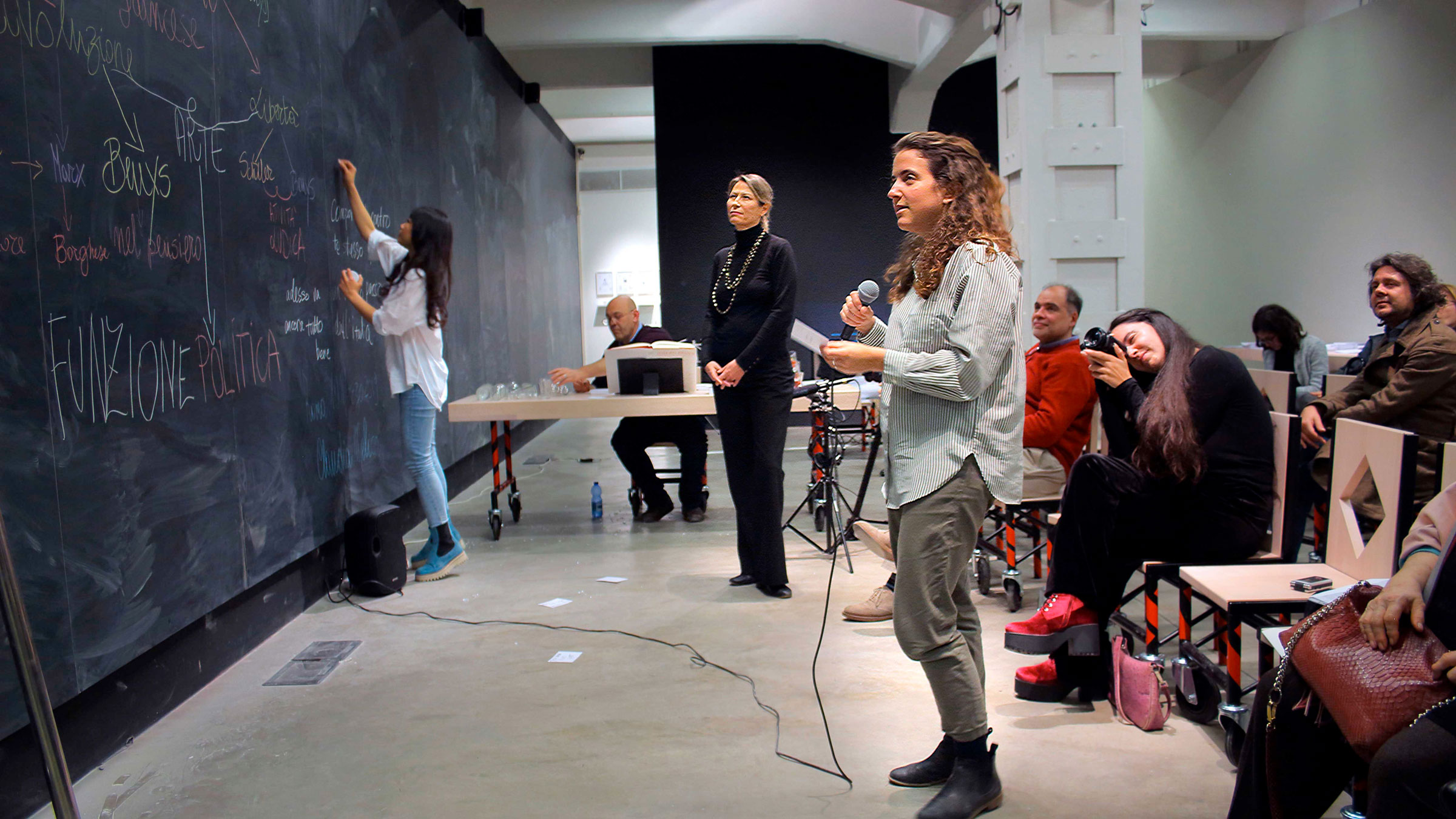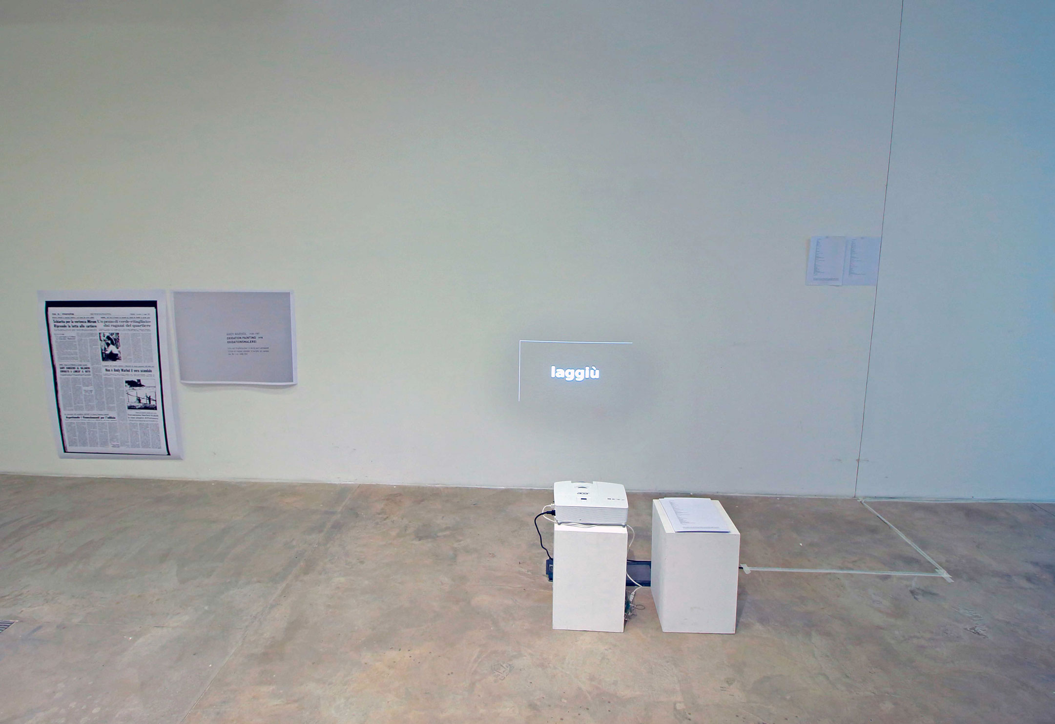 Installazioni e Altri materiali: (1) claudioadami: qual è la parola, 2015, programma sviluppato per scheda raspberry, proiezione (2) P. Cesarini Sforza: Senza titolo, 2018, lastra di piombo su tavola (3) P. Cesarini Sforza: Album, 2019, tecnica mista su album fotografico (4) Claudia Melica e Tianyi Xu: Matita su Schiller, 2019, video, montaggio di fotografie delle pagine del libro L’educazione estetica di Friedrich Schiller sottolineate e annotate a matita da Claudia Melica (5) R. De Simone: Intervallo, 2004, ingrandimento fotografico (6) M. Pieroni – D. Stiefelmeier: documenti d’archivio selezionati da D. Borromeo (7) P. Polidori: Due manifesti tratti da Majakovskij, 2018, stampa su carta (8) M. Zantor: Joseph Beuys is always looking at you, 2018, ingrandimento di fotogramma su carta (9) F. De Filippi: La strada del latte, 2019, video proiezione di una selezione di disegni dal 1974 al 1978 (10) F. De Filippi: Posta inviata nel 1973 agli artisti. (Con una risposta di Sandro Chia), 1973, tre ingrandimenti fotografici (11) M. Folci: Concerto transumante per flatus vocis, 2005, video, ingrandimenti di fotogrammi, testo stampato (12) P. Polidori: Prove di trazione, 2018, tre video documentazioni di azioni operate su tre volumi: Charles Batteux, Le Belle Arti ricondotte ad un unico principio, Bologna 1983; Max Horkheimer e Theodor Adorno, Dialettica dell’illuminismo, Torino 1966; Martin Heidegger, Sentieri interrotti, Firenze 1984 (13) P. Polidori: Non è Andy Warhol il vero scandalo, pagina de L’Unità dell’11 maggio 1977, ingrandimento fotografico + Didascalia di Andy Warhol, Oxidation Painting 1978 dal Museo Brandhorst di Monaco di Baviera, ingrandimento fotografico (14) F. Santoro: La voltapagine, 2018-2019, 8 audio-registrazioni vocali: Immobile (Beckett); I cinque secondi di Beckett; Inizio de La linea; L’educazione sentimentale Volume 1; L’educazione sentimentale Volume 2 (breve); L’educazione sentimentale Volume 2; Uno a cento; L’ultima pagina di Altrove di Michaux (15) F. Santoro: Trascrizione dell’Educazione sentimentale, 2019, stampa su carta (16) D. Villa Zorn: 7 collage: On the brink of…, 2015; Temptation of Dictatorship, 2012; The narrow path, 2013; Shipwreck, 2012; Revelation, 2018; The Cannibal Rome Epiphany, 2013; com’è difficile tornare a casa, 2014; ingrandimenti fotografici.