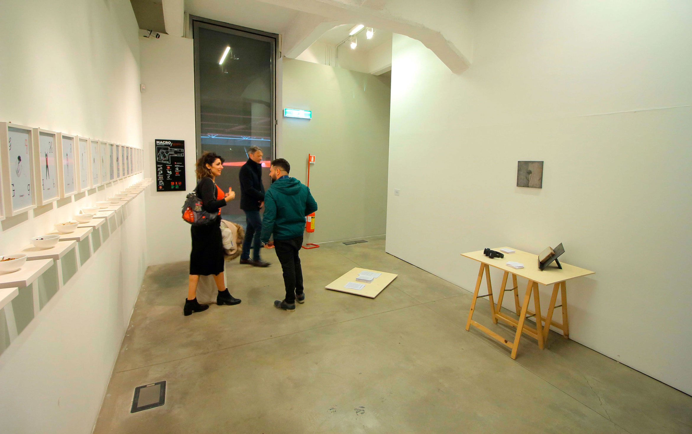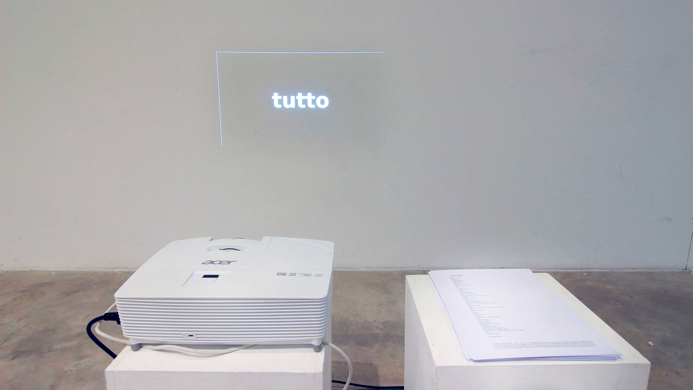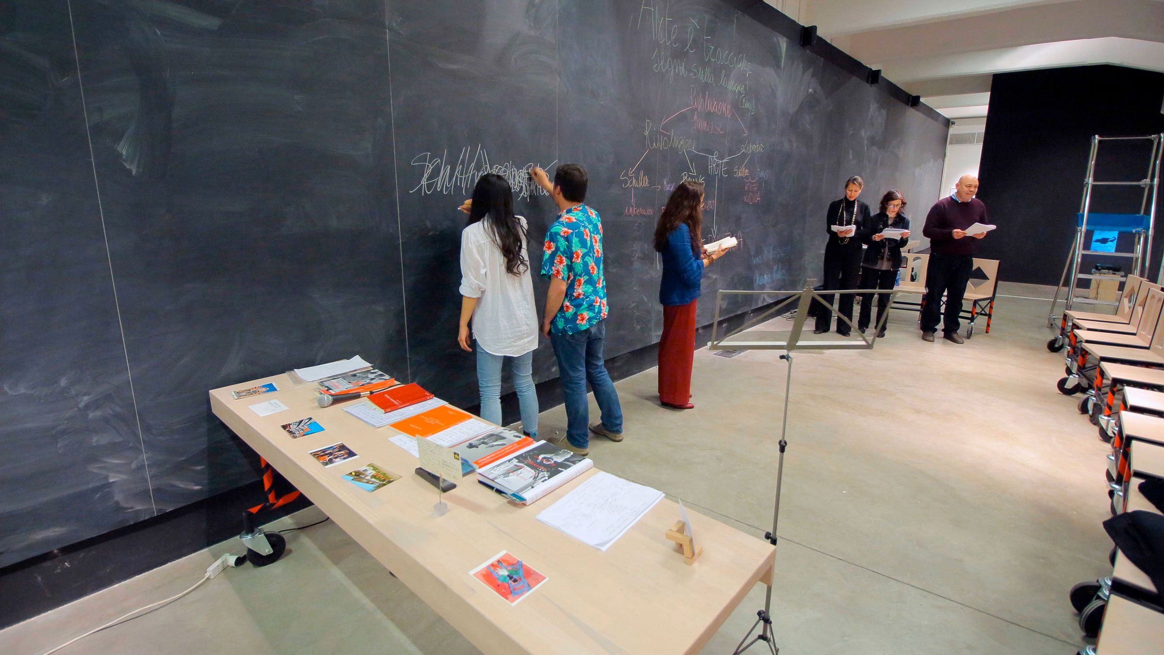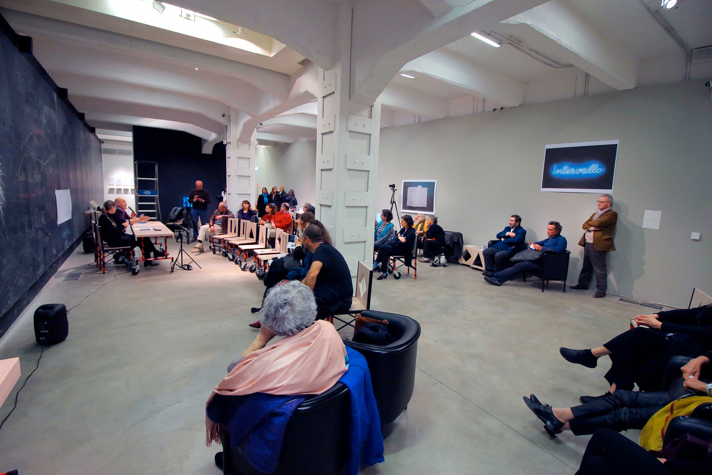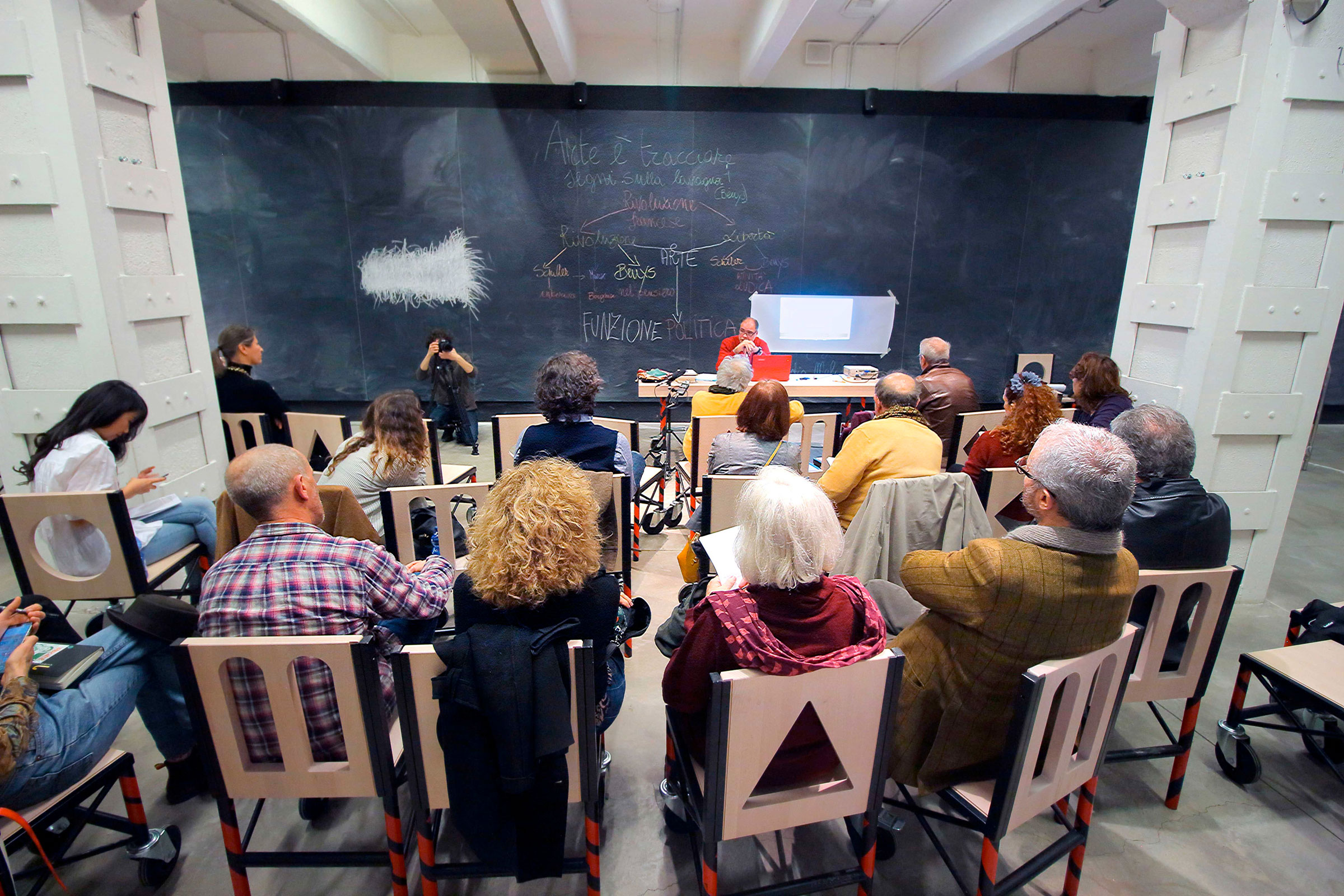 Installazioni e Altri materiali: (1) claudioadami: qual è la parola, 2015, programma sviluppato per scheda raspberry, proiezione (2) P. Cesarini Sforza: Senza titolo, 2018, lastra di piombo su tavola (3) P. Cesarini Sforza: Album, 2019, tecnica mista su album fotografico (4) Claudia Melica e Tianyi Xu: Matita su Schiller, 2019, video, montaggio di fotografie delle pagine del libro L’educazione estetica di Friedrich Schiller sottolineate e annotate a matita da Claudia Melica (5) R. De Simone: Intervallo, 2004, ingrandimento fotografico (6) M. Pieroni – D. Stiefelmeier: documenti d’archivio selezionati da D. Borromeo (7) P. Polidori: Due manifesti tratti da Majakovskij, 2018, stampa su carta (8) M. Zantor: Joseph Beuys is always looking at you, 2018, ingrandimento di fotogramma su carta (9) F. De Filippi: La strada del latte, 2019, video proiezione di una selezione di disegni dal 1974 al 1978 (10) F. De Filippi: Posta inviata nel 1973 agli artisti. (Con una risposta di Sandro Chia), 1973, tre ingrandimenti fotografici (11) M. Folci: Concerto transumante per flatus vocis, 2005, video, ingrandimenti di fotogrammi, testo stampato (12) P. Polidori: Prove di trazione, 2018, tre video documentazioni di azioni operate su tre volumi: Charles Batteux, Le Belle Arti ricondotte ad un unico principio, Bologna 1983; Max Horkheimer e Theodor Adorno, Dialettica dell’illuminismo, Torino 1966; Martin Heidegger, Sentieri interrotti, Firenze 1984 (13) P. Polidori: Non è Andy Warhol il vero scandalo, pagina de L’Unità dell’11 maggio 1977, ingrandimento fotografico + Didascalia di Andy Warhol, Oxidation Painting 1978 dal Museo Brandhorst di Monaco di Baviera, ingrandimento fotografico (14) F. Santoro: La voltapagine, 2018-2019, 8 audio-registrazioni vocali: Immobile (Beckett); I cinque secondi di Beckett; Inizio de La linea; L’educazione sentimentale Volume 1; L’educazione sentimentale Volume 2 (breve); L’educazione sentimentale Volume 2; Uno a cento; L’ultima pagina di Altrove di Michaux (15) F. Santoro: Trascrizione dell’Educazione sentimentale, 2019, stampa su carta (16) D. Villa Zorn: 7 collage: On the brink of…, 2015; Temptation of Dictatorship, 2012; The narrow path, 2013; Shipwreck, 2012; Revelation, 2018; The Cannibal Rome Epiphany, 2013; com’è difficile tornare a casa, 2014; ingrandimenti fotografici.