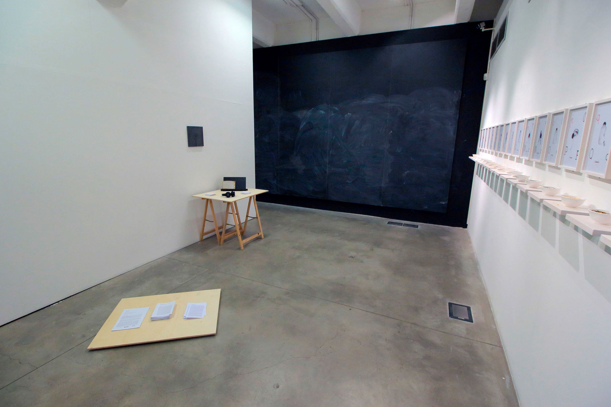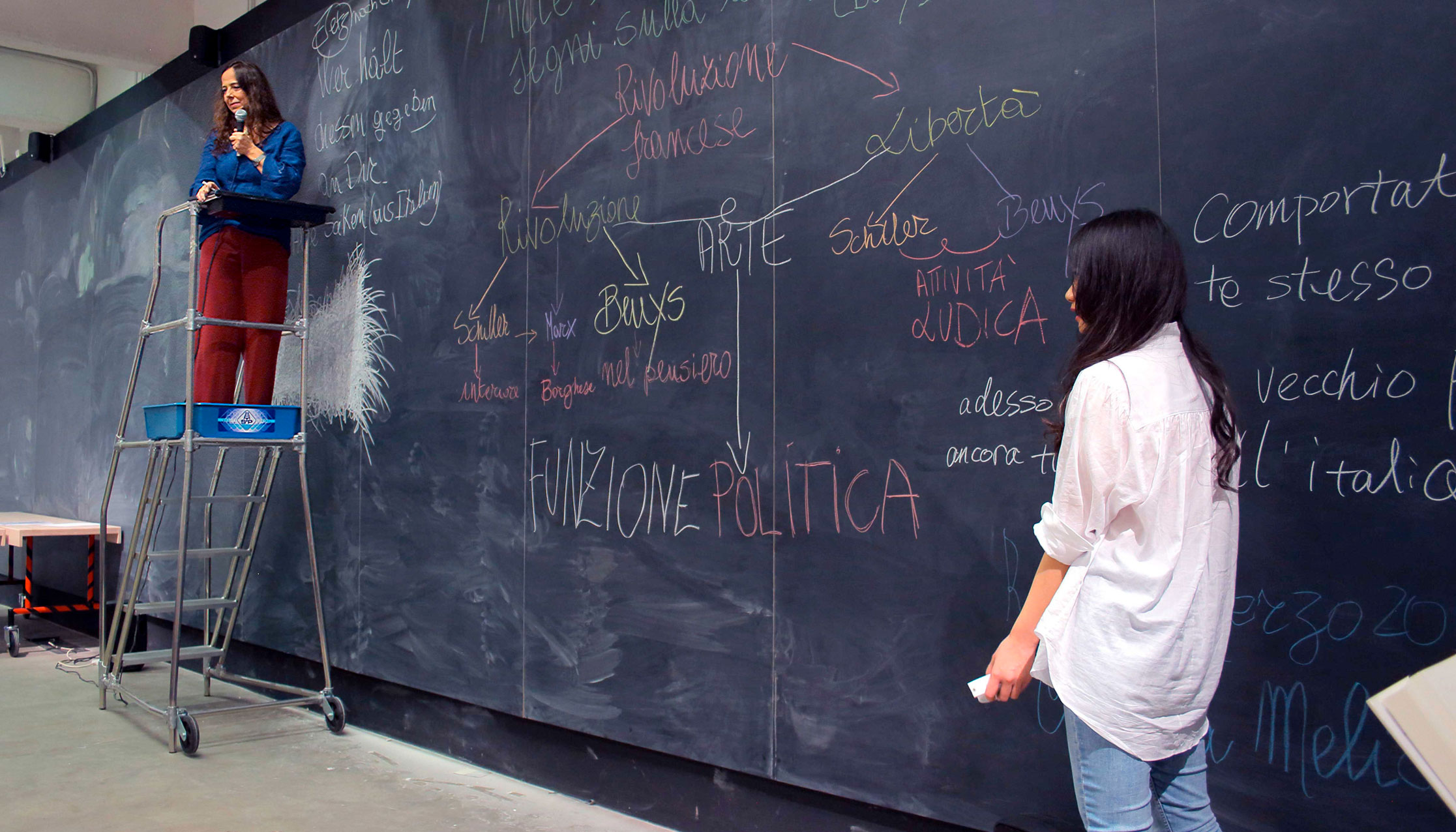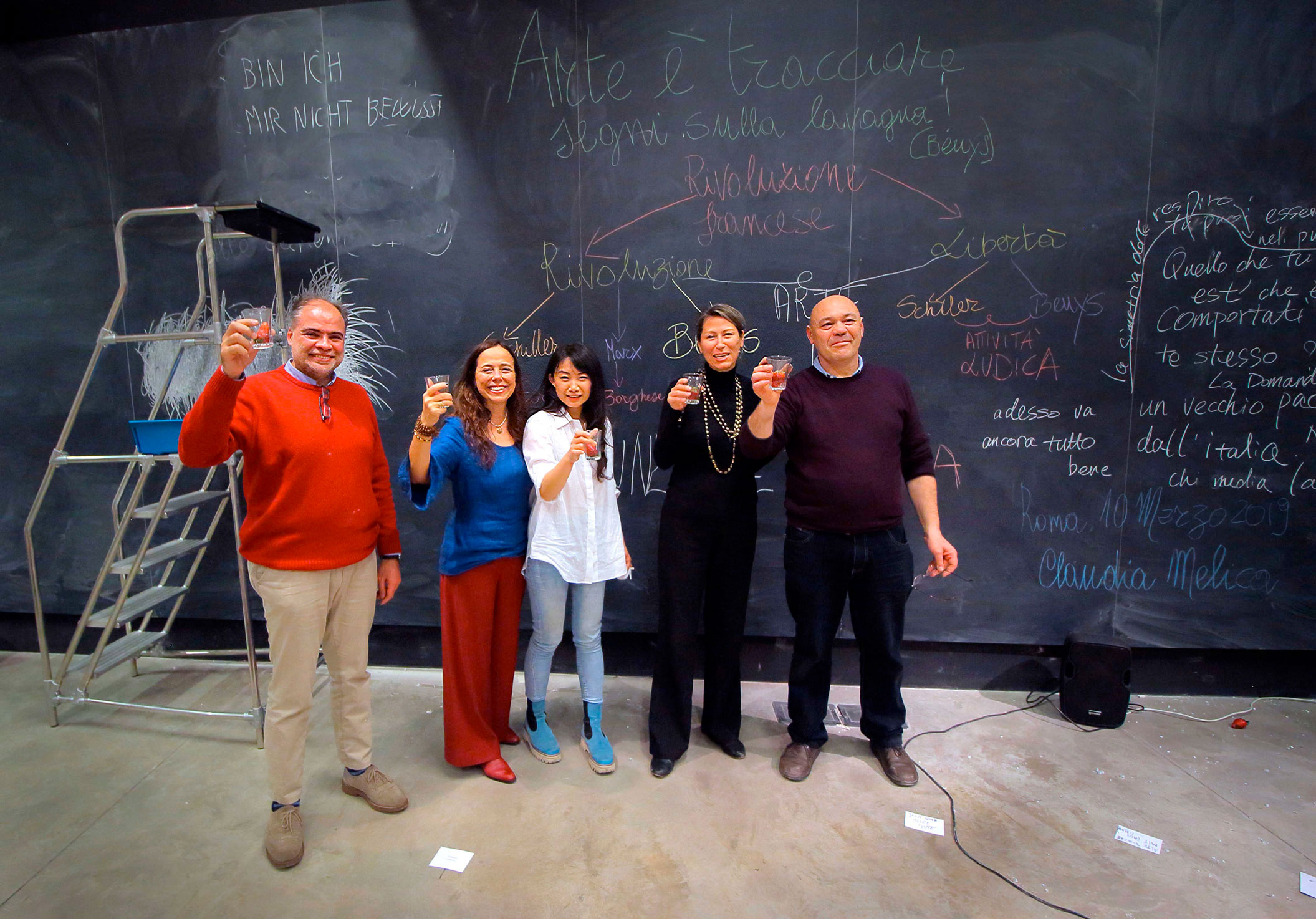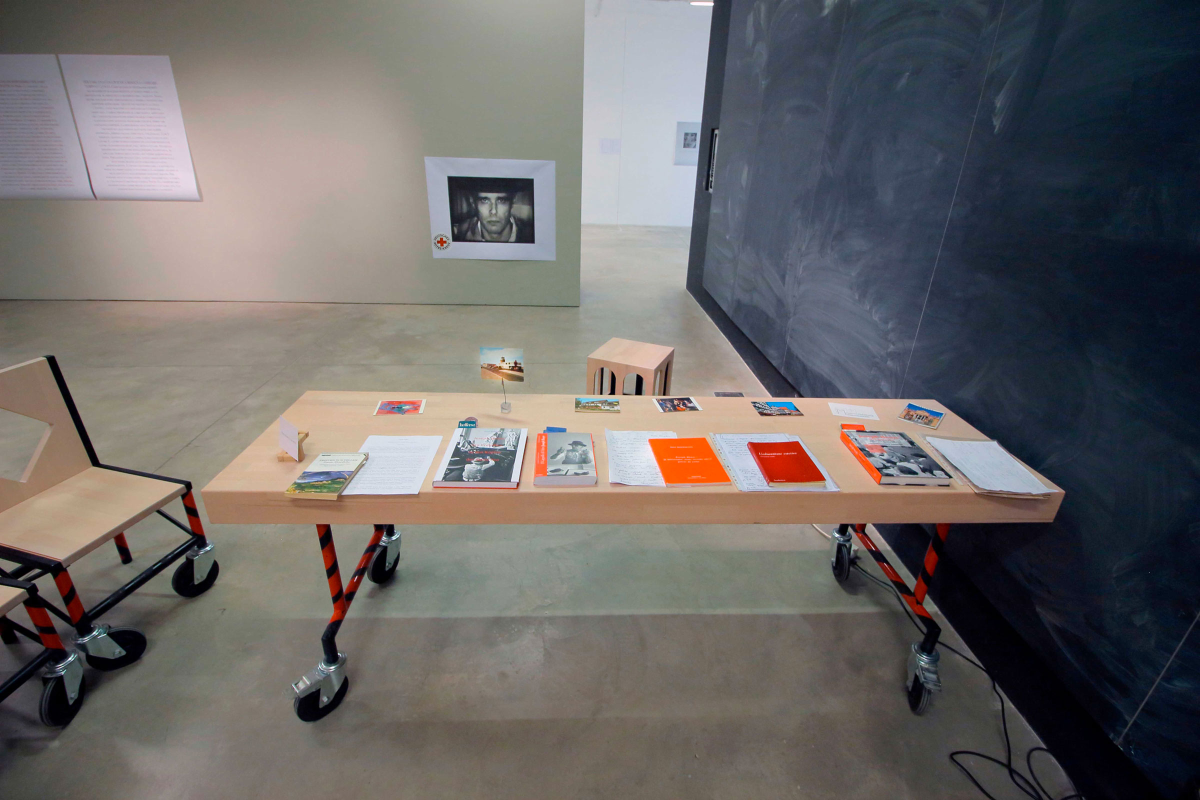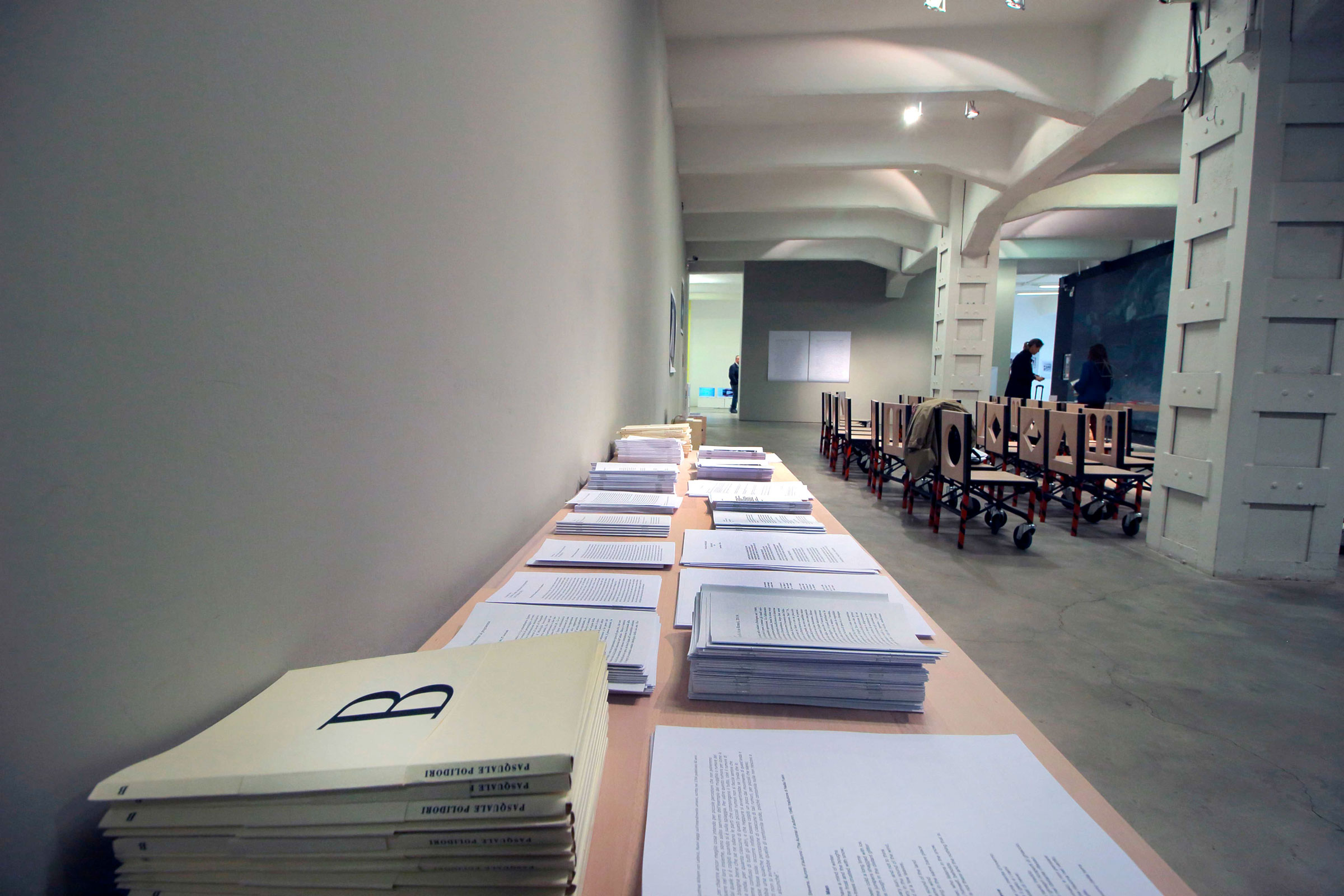 Installazioni e Altri materiali: (1) claudioadami: qual è la parola, 2015, programma sviluppato per scheda raspberry, proiezione (2) P. Cesarini Sforza: Senza titolo, 2018, lastra di piombo su tavola (3) P. Cesarini Sforza: Album, 2019, tecnica mista su album fotografico (4) Claudia Melica e Tianyi Xu: Matita su Schiller, 2019, video, montaggio di fotografie delle pagine del libro L’educazione estetica di Friedrich Schiller sottolineate e annotate a matita da Claudia Melica (5) R. De Simone: Intervallo, 2004, ingrandimento fotografico (6) M. Pieroni – D. Stiefelmeier: documenti d’archivio selezionati da D. Borromeo (7) P. Polidori: Due manifesti tratti da Majakovskij, 2018, stampa su carta (8) M. Zantor: Joseph Beuys is always looking at you, 2018, ingrandimento di fotogramma su carta (9) F. De Filippi: La strada del latte, 2019, video proiezione di una selezione di disegni dal 1974 al 1978 (10) F. De Filippi: Posta inviata nel 1973 agli artisti. (Con una risposta di Sandro Chia), 1973, tre ingrandimenti fotografici (11) M. Folci: Concerto transumante per flatus vocis, 2005, video, ingrandimenti di fotogrammi, testo stampato (12) P. Polidori: Prove di trazione, 2018, tre video documentazioni di azioni operate su tre volumi: Charles Batteux, Le Belle Arti ricondotte ad un unico principio, Bologna 1983; Max Horkheimer e Theodor Adorno, Dialettica dell’illuminismo, Torino 1966; Martin Heidegger, Sentieri interrotti, Firenze 1984 (13) P. Polidori: Non è Andy Warhol il vero scandalo, pagina de L’Unità dell’11 maggio 1977, ingrandimento fotografico + Didascalia di Andy Warhol, Oxidation Painting 1978 dal Museo Brandhorst di Monaco di Baviera, ingrandimento fotografico (14) F. Santoro: La voltapagine, 2018-2019, 8 audio-registrazioni vocali: Immobile (Beckett); I cinque secondi di Beckett; Inizio de La linea; L’educazione sentimentale Volume 1; L’educazione sentimentale Volume 2 (breve); L’educazione sentimentale Volume 2; Uno a cento; L’ultima pagina di Altrove di Michaux (15) F. Santoro: Trascrizione dell’Educazione sentimentale, 2019, stampa su carta (16) D. Villa Zorn: 7 collage: On the brink of…, 2015; Temptation of Dictatorship, 2012; The narrow path, 2013; Shipwreck, 2012; Revelation, 2018; The Cannibal Rome Epiphany, 2013; com’è difficile tornare a casa, 2014; ingrandimenti fotografici.