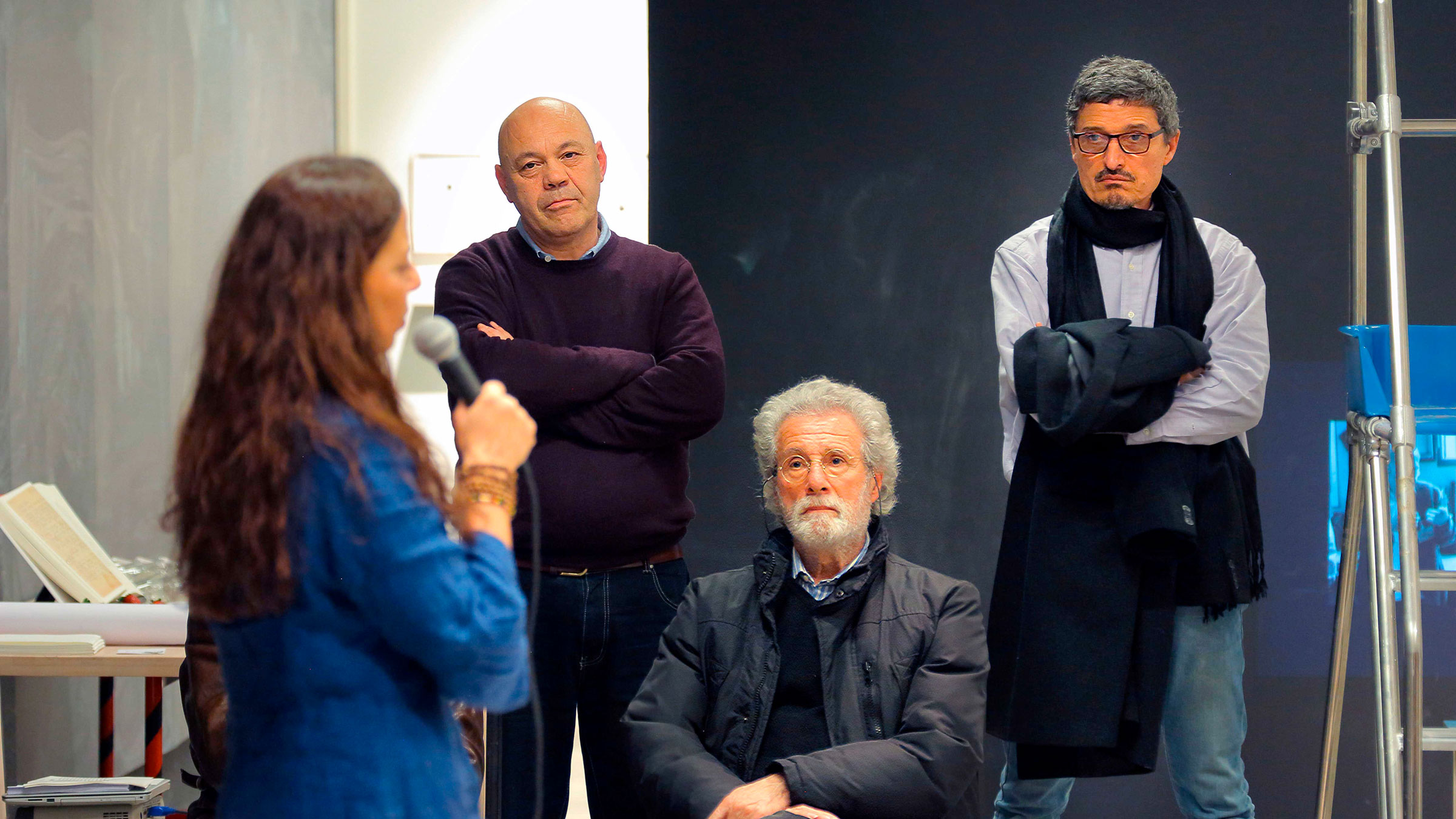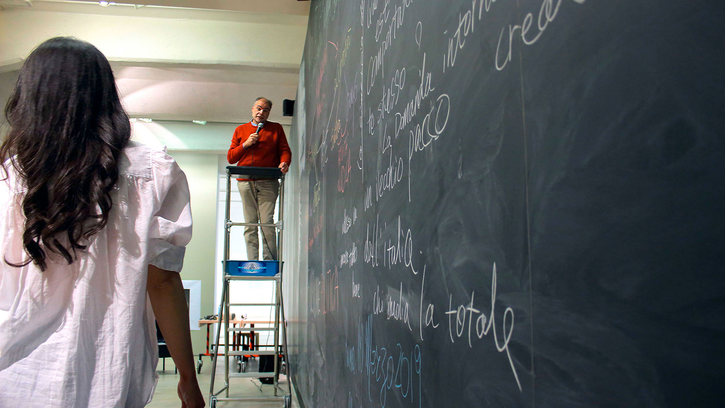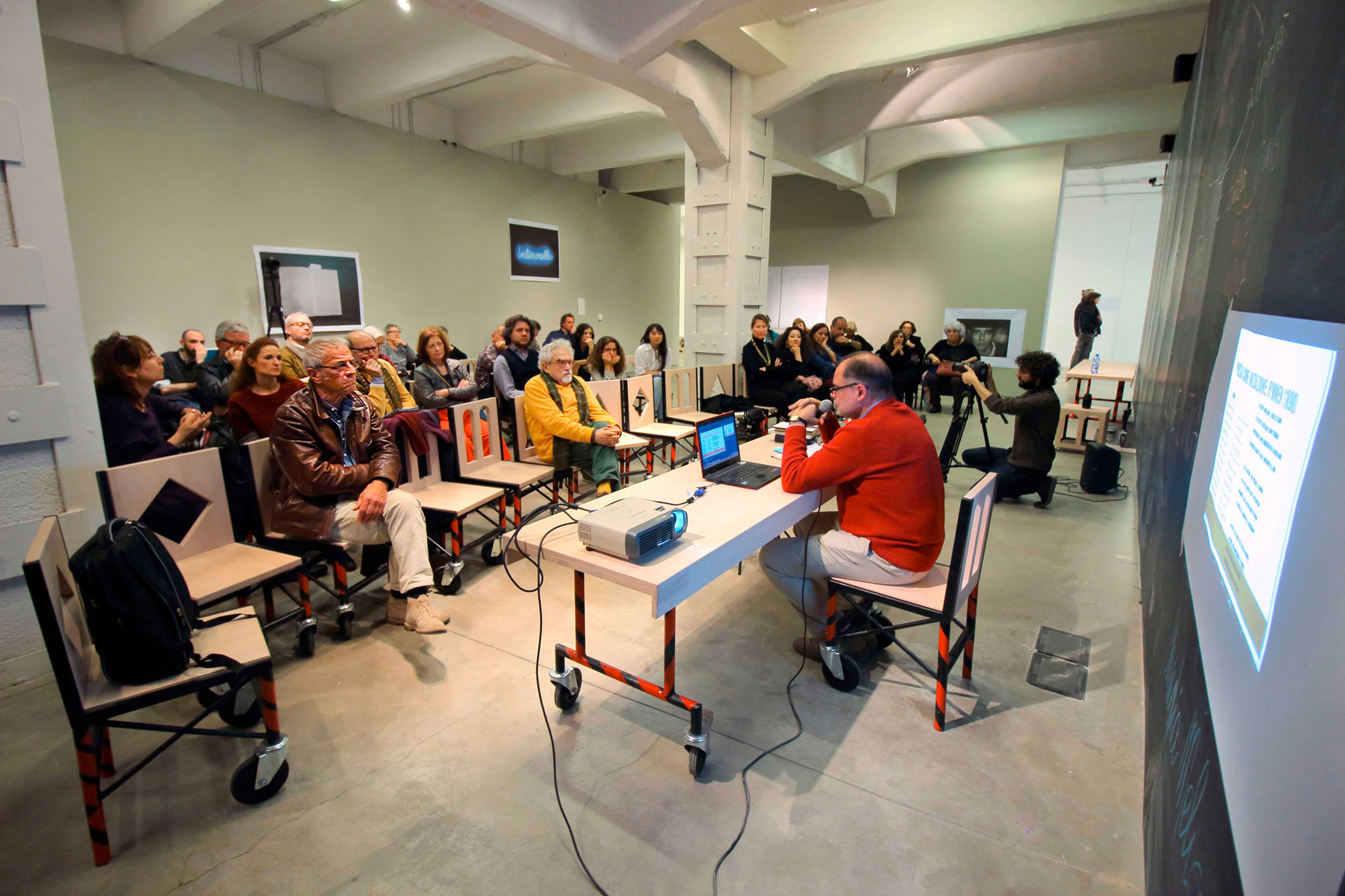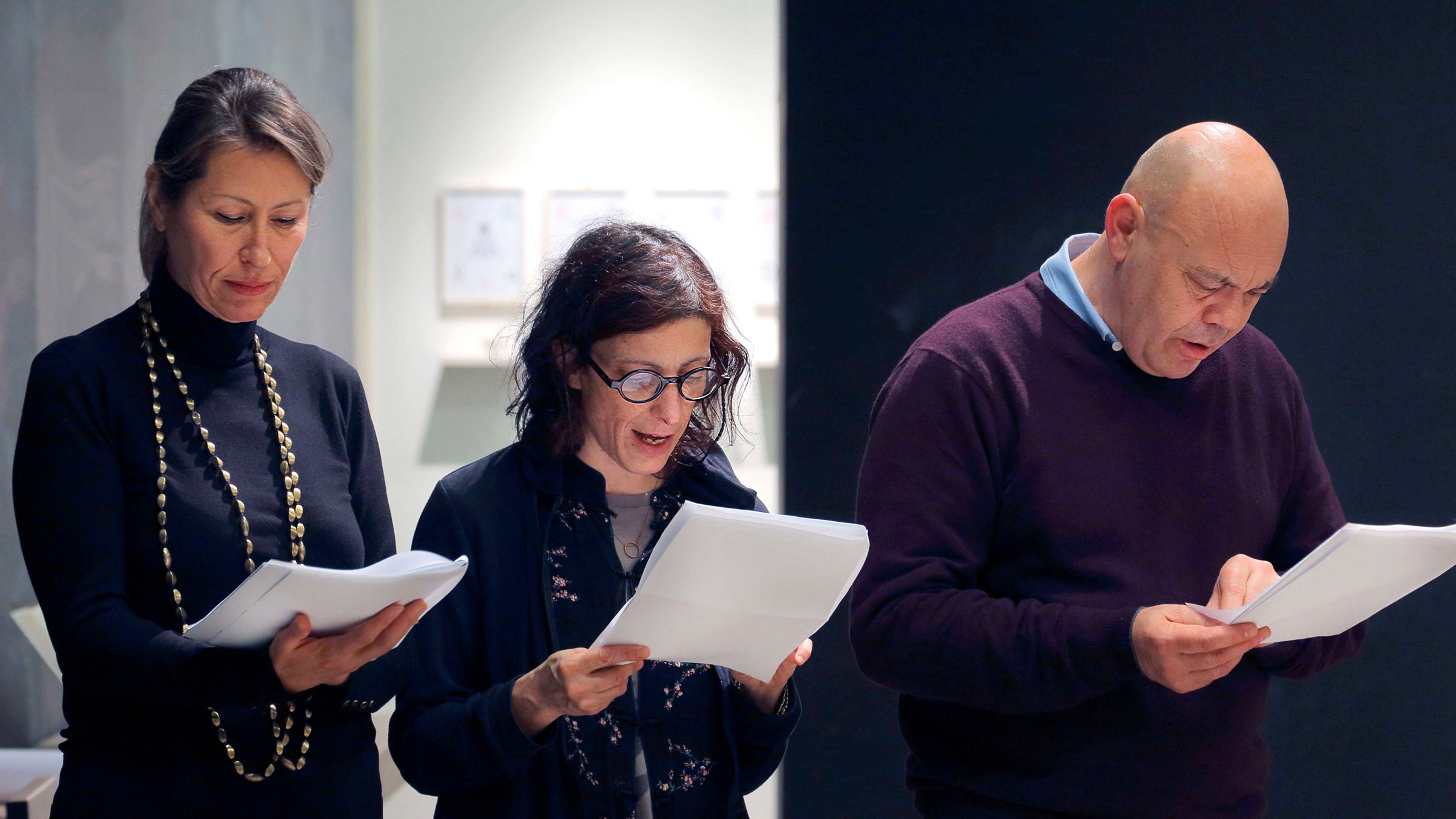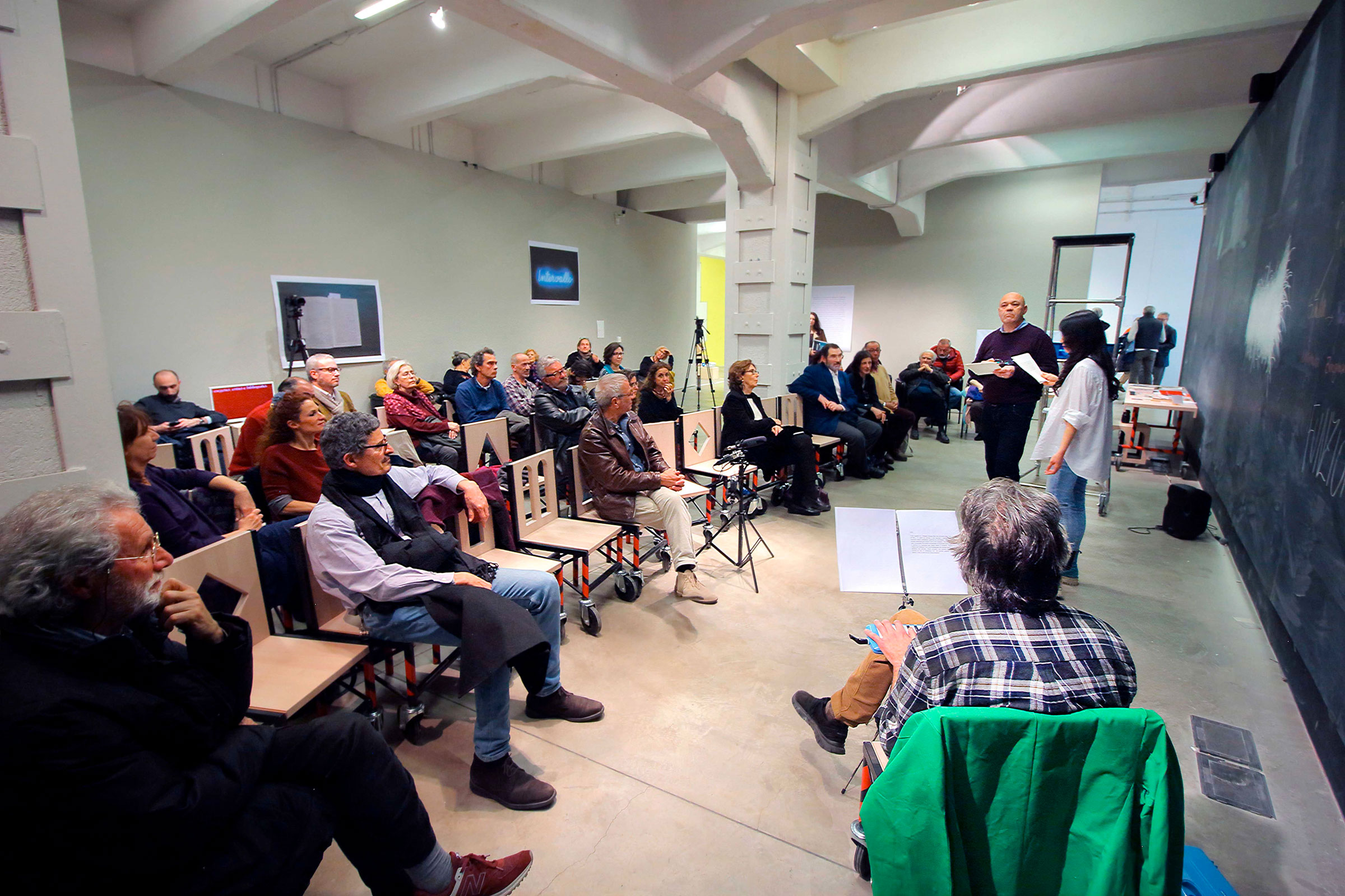 Installazioni e Altri materiali: (1) claudioadami: qual è la parola, 2015, programma sviluppato per scheda raspberry, proiezione (2) P. Cesarini Sforza: Senza titolo, 2018, lastra di piombo su tavola (3) P. Cesarini Sforza: Album, 2019, tecnica mista su album fotografico (4) Claudia Melica e Tianyi Xu: Matita su Schiller, 2019, video, montaggio di fotografie delle pagine del libro L’educazione estetica di Friedrich Schiller sottolineate e annotate a matita da Claudia Melica (5) R. De Simone: Intervallo, 2004, ingrandimento fotografico (6) M. Pieroni – D. Stiefelmeier: documenti d’archivio selezionati da D. Borromeo (7) P. Polidori: Due manifesti tratti da Majakovskij, 2018, stampa su carta (8) M. Zantor: Joseph Beuys is always looking at you, 2018, ingrandimento di fotogramma su carta (9) F. De Filippi: La strada del latte, 2019, video proiezione di una selezione di disegni dal 1974 al 1978 (10) F. De Filippi: Posta inviata nel 1973 agli artisti. (Con una risposta di Sandro Chia), 1973, tre ingrandimenti fotografici (11) M. Folci: Concerto transumante per flatus vocis, 2005, video, ingrandimenti di fotogrammi, testo stampato (12) P. Polidori: Prove di trazione, 2018, tre video documentazioni di azioni operate su tre volumi: Charles Batteux, Le Belle Arti ricondotte ad un unico principio, Bologna 1983; Max Horkheimer e Theodor Adorno, Dialettica dell’illuminismo, Torino 1966; Martin Heidegger, Sentieri interrotti, Firenze 1984 (13) P. Polidori: Non è Andy Warhol il vero scandalo, pagina de L’Unità dell’11 maggio 1977, ingrandimento fotografico + Didascalia di Andy Warhol, Oxidation Painting 1978 dal Museo Brandhorst di Monaco di Baviera, ingrandimento fotografico (14) F. Santoro: La voltapagine, 2018-2019, 8 audio-registrazioni vocali: Immobile (Beckett); I cinque secondi di Beckett; Inizio de La linea; L’educazione sentimentale Volume 1; L’educazione sentimentale Volume 2 (breve); L’educazione sentimentale Volume 2; Uno a cento; L’ultima pagina di Altrove di Michaux (15) F. Santoro: Trascrizione dell’Educazione sentimentale, 2019, stampa su carta (16) D. Villa Zorn: 7 collage: On the brink of…, 2015; Temptation of Dictatorship, 2012; The narrow path, 2013; Shipwreck, 2012; Revelation, 2018; The Cannibal Rome Epiphany, 2013; com’è difficile tornare a casa, 2014; ingrandimenti fotografici.
