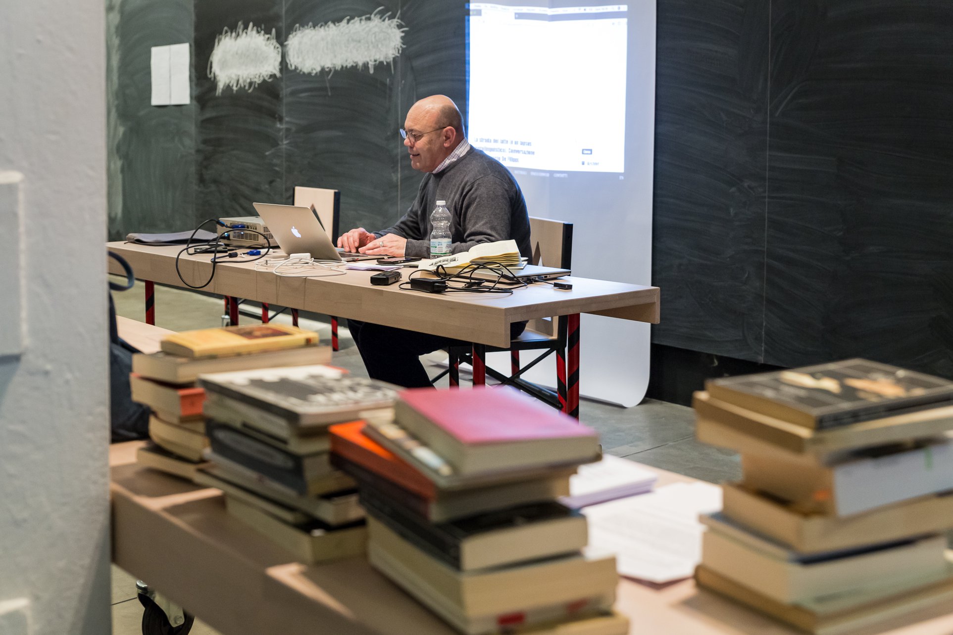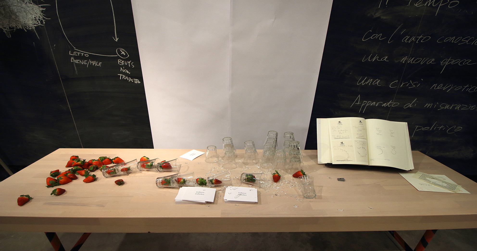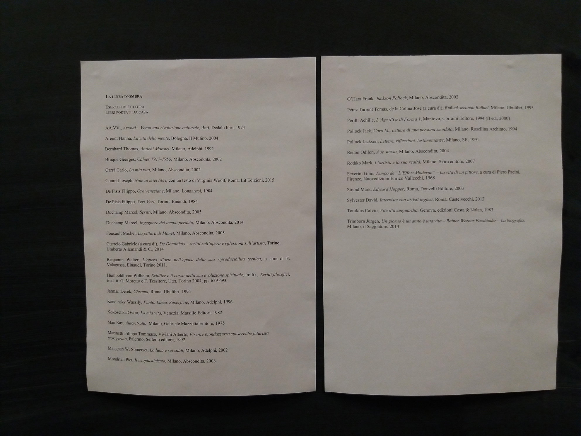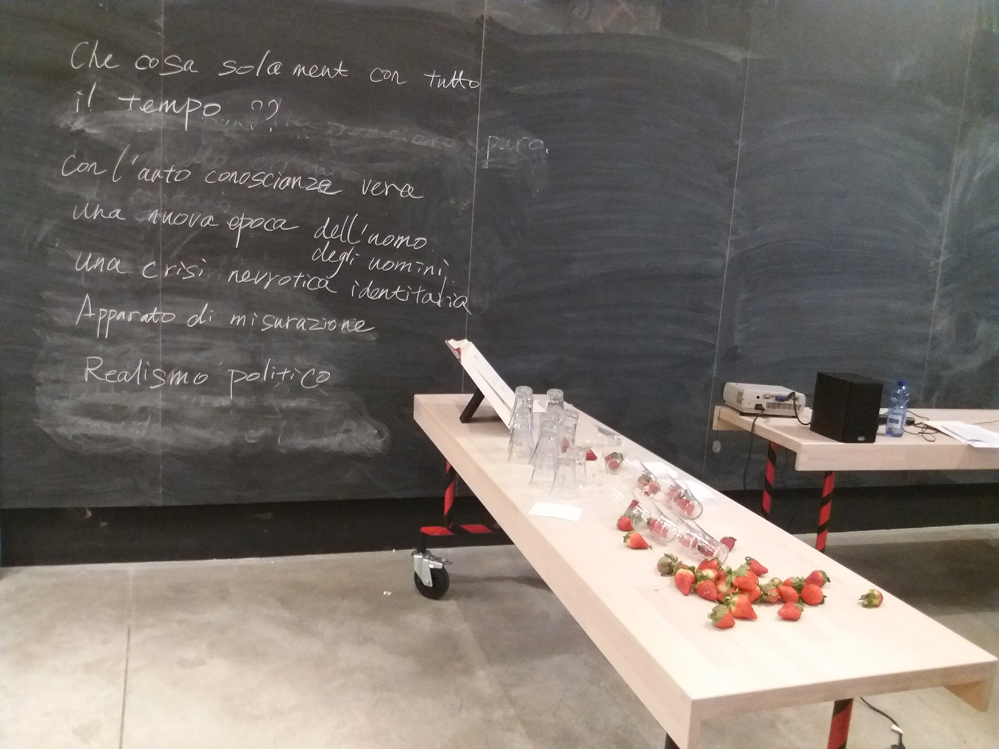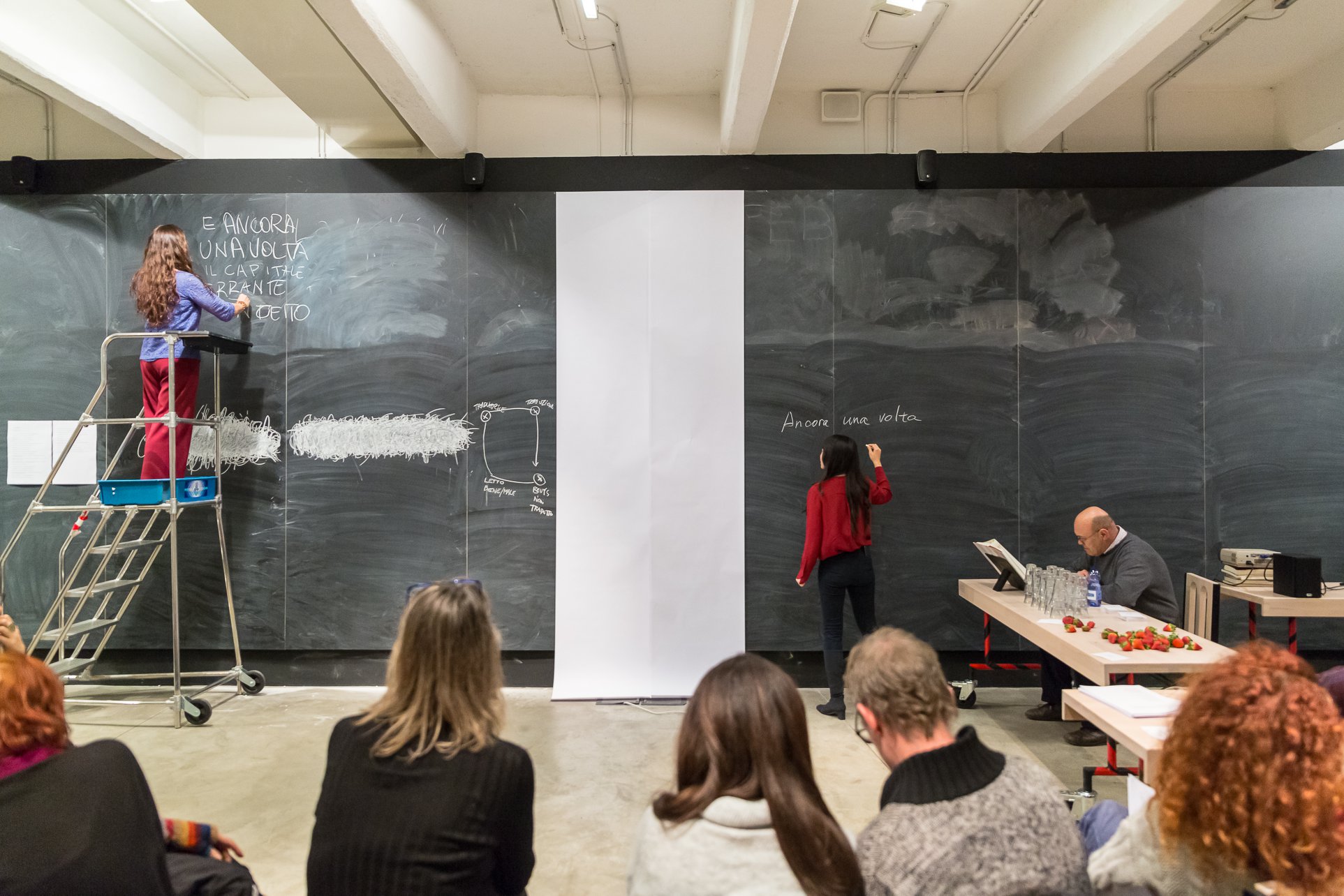 Interventi: (1) D. Borromeo, C. Melica, P. Polidori, F. Santoro: Esercizi di lettura. Scelta di scritti biografici e teorici di artisti. Con la partecipazione di Tianyi Xu e Daniele Villa Zorn. (2) P. Polidori: Introduzione a La linea d’ombra. Il personaggio Beuys. Ipotesi narrativa: ogni persona è un artista, ogni artista è un personaggio, ogni personaggio è una pin up; l’arte come elaborazione teatrale di sé. Tra Joseph Beuys e Vettor Pisani. (3) C. Pietroiusti con F. Hornung, G. Garrera, C. Melica, F. Santoro: Non si finisce mai di rimuovere. Lettura e discussione sulle parole rimosse nelle poesie di Cesare Pietroiusti tradotte in tedesco da Frank Hornung. (4) M. Sartori, Presentazione di due opere sonore: Il suono della lingua (2008); Preghiera a sua madre perché muoia (2016). Ovvero: sulle modalità di materializzazione, traduzione e ricomposizione della lingua a partire da un dato testo poetico. (5) P. Polidori con C. Melica, T. Xu, D. Borromeo et al.: Lettura d’attesa / Erdbeeren – Erdbeben. Scelta di brevi testi provenienti dai disegni di Beuys tradotti all’impronta e trascritti alla lavagna, azione.