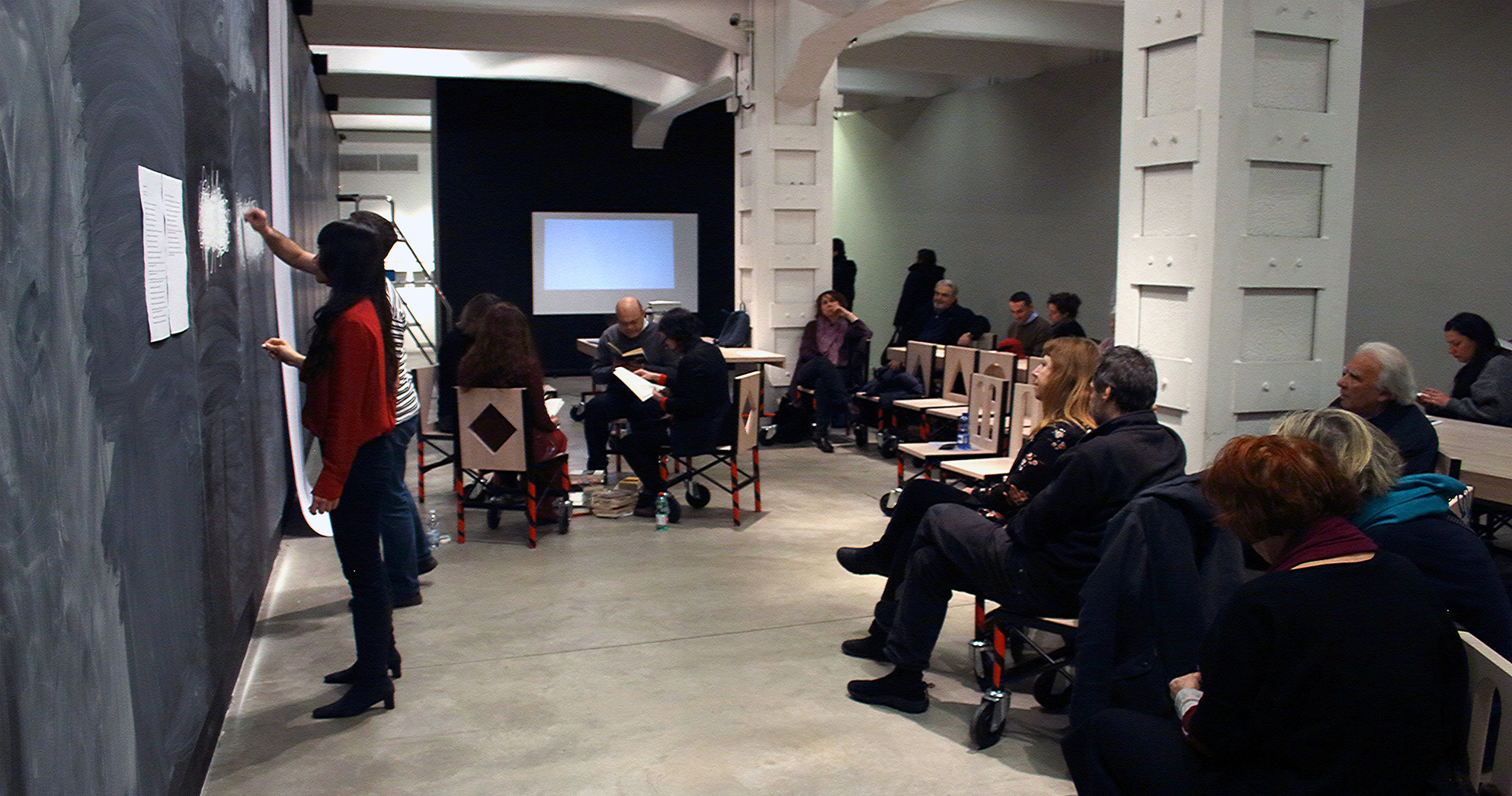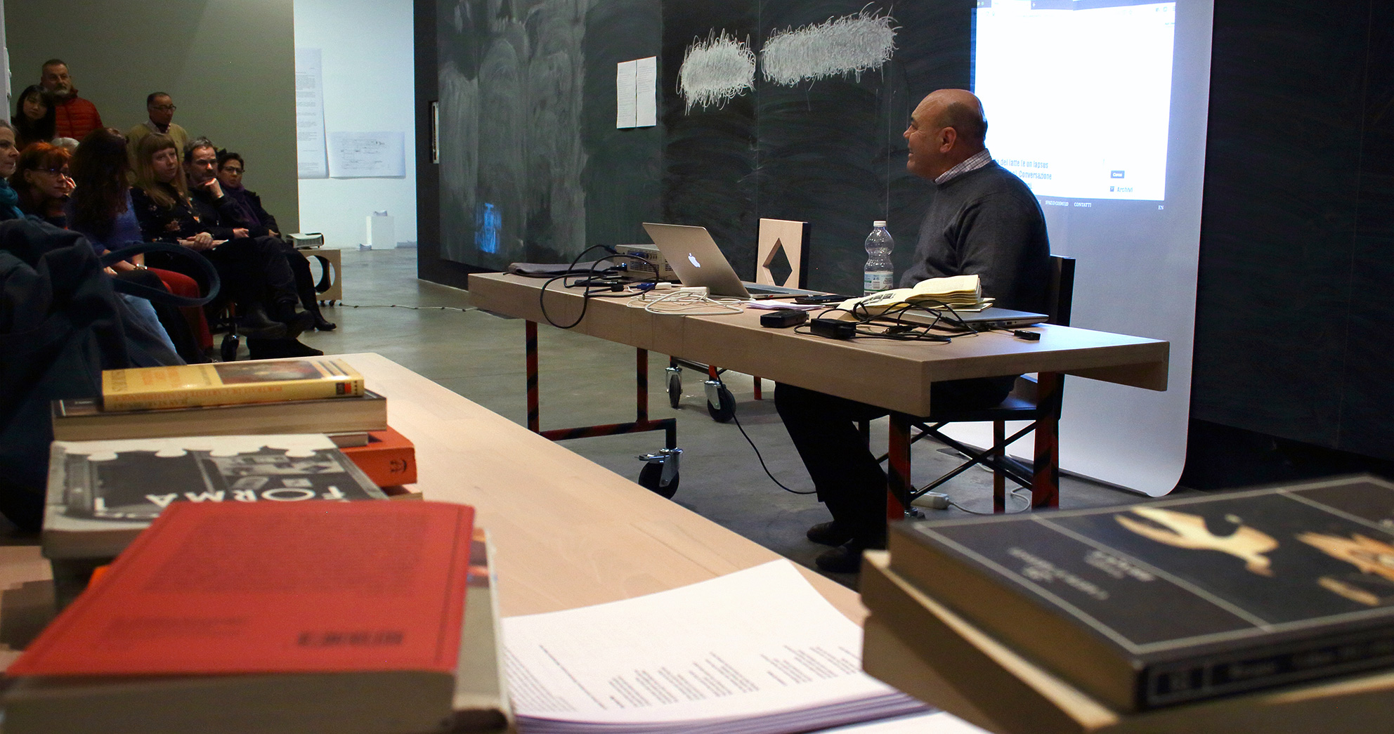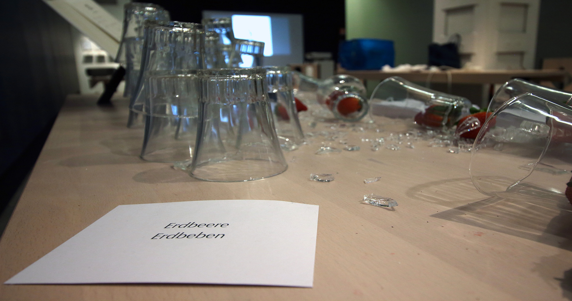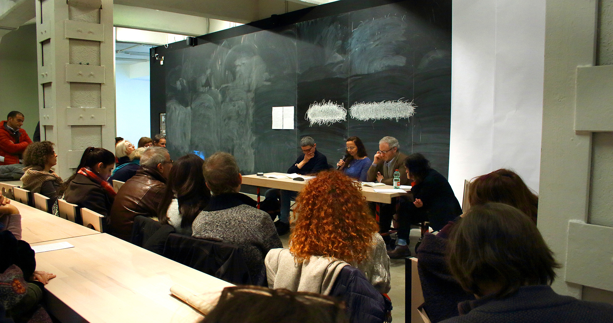 Interventi: (1) D. Borromeo, C. Melica, P. Polidori, F. Santoro: Esercizi di lettura. Scelta di scritti biografici e teorici di artisti. Con la partecipazione di Tianyi Xu e Daniele Villa Zorn. (2) P. Polidori: Introduzione a La linea d’ombra. Il personaggio Beuys. Ipotesi narrativa: ogni persona è un artista, ogni artista è un personaggio, ogni personaggio è una pin up; l’arte come elaborazione teatrale di sé. Tra Joseph Beuys e Vettor Pisani. (3) C. Pietroiusti con F. Hornung, G. Garrera, C. Melica, F. Santoro: Non si finisce mai di rimuovere. Lettura e discussione sulle parole rimosse nelle poesie di Cesare Pietroiusti tradotte in tedesco da Frank Hornung. (4) M. Sartori, Presentazione di due opere sonore: Il suono della lingua (2008); Preghiera a sua madre perché muoia (2016). Ovvero: sulle modalità di materializzazione, traduzione e ricomposizione della lingua a partire da un dato testo poetico. (5) P. Polidori con C. Melica, T. Xu, D. Borromeo et al.: Lettura d’attesa / Erdbeeren – Erdbeben. Scelta di brevi testi provenienti dai disegni di Beuys tradotti all’impronta e trascritti alla lavagna, azione.