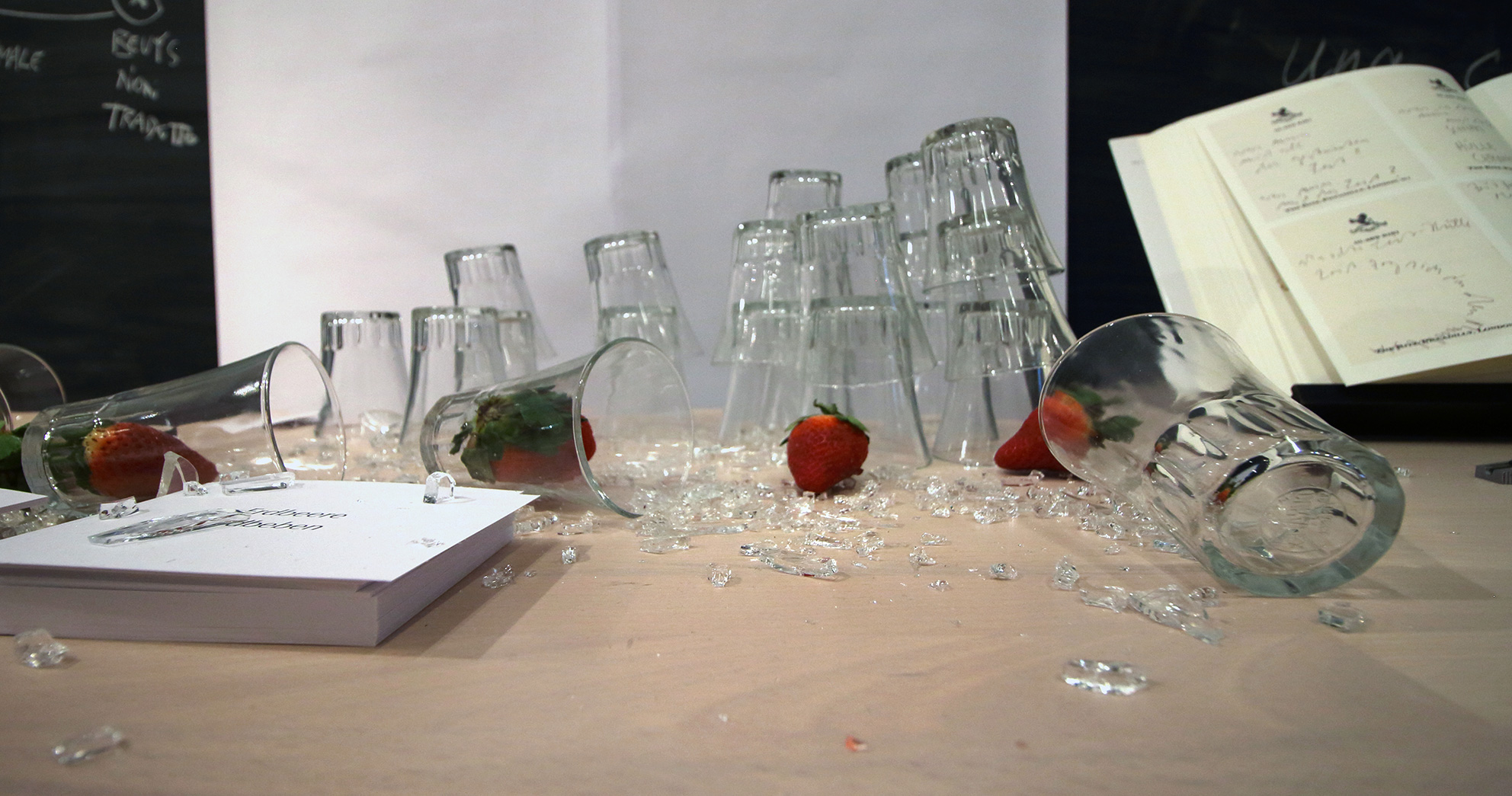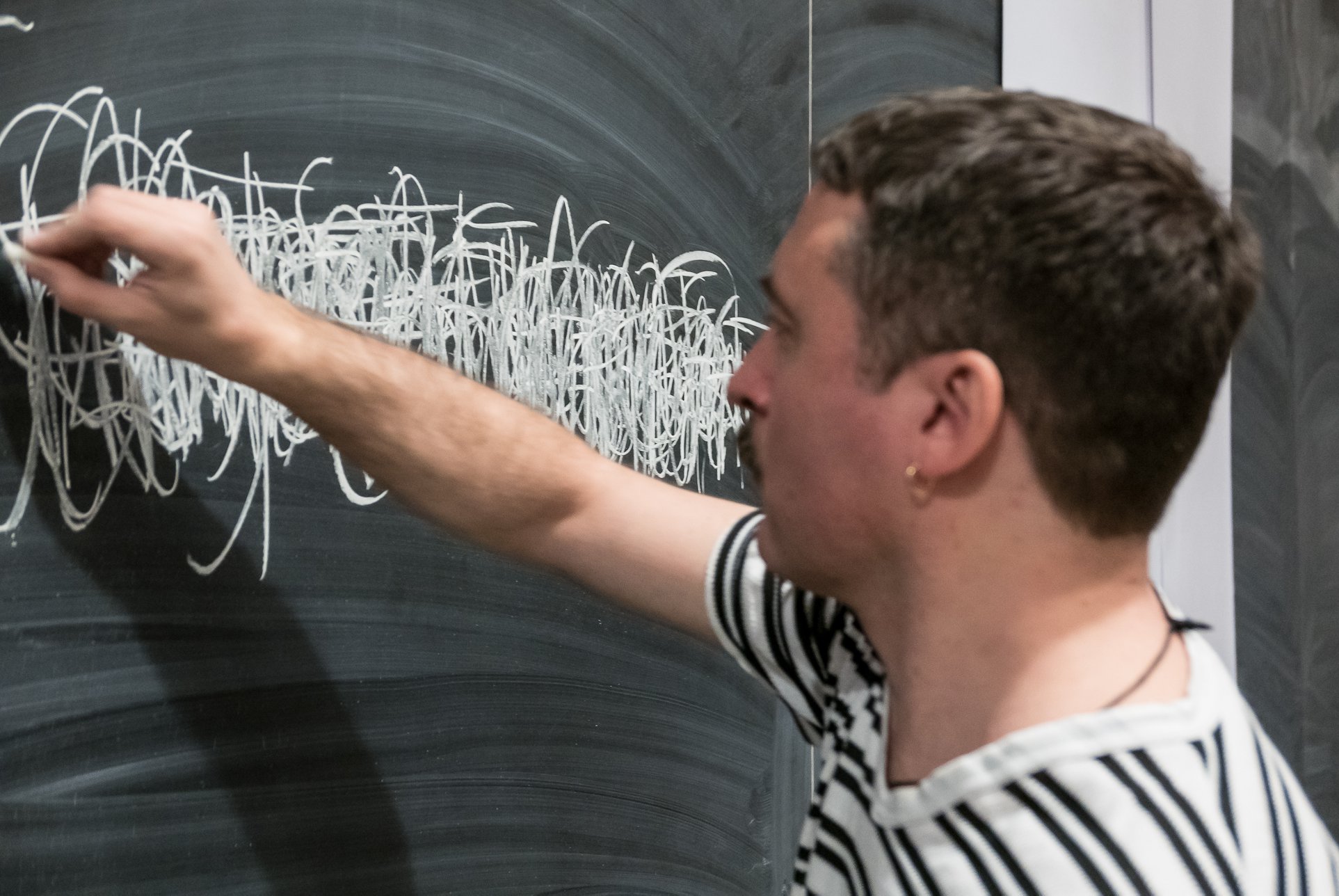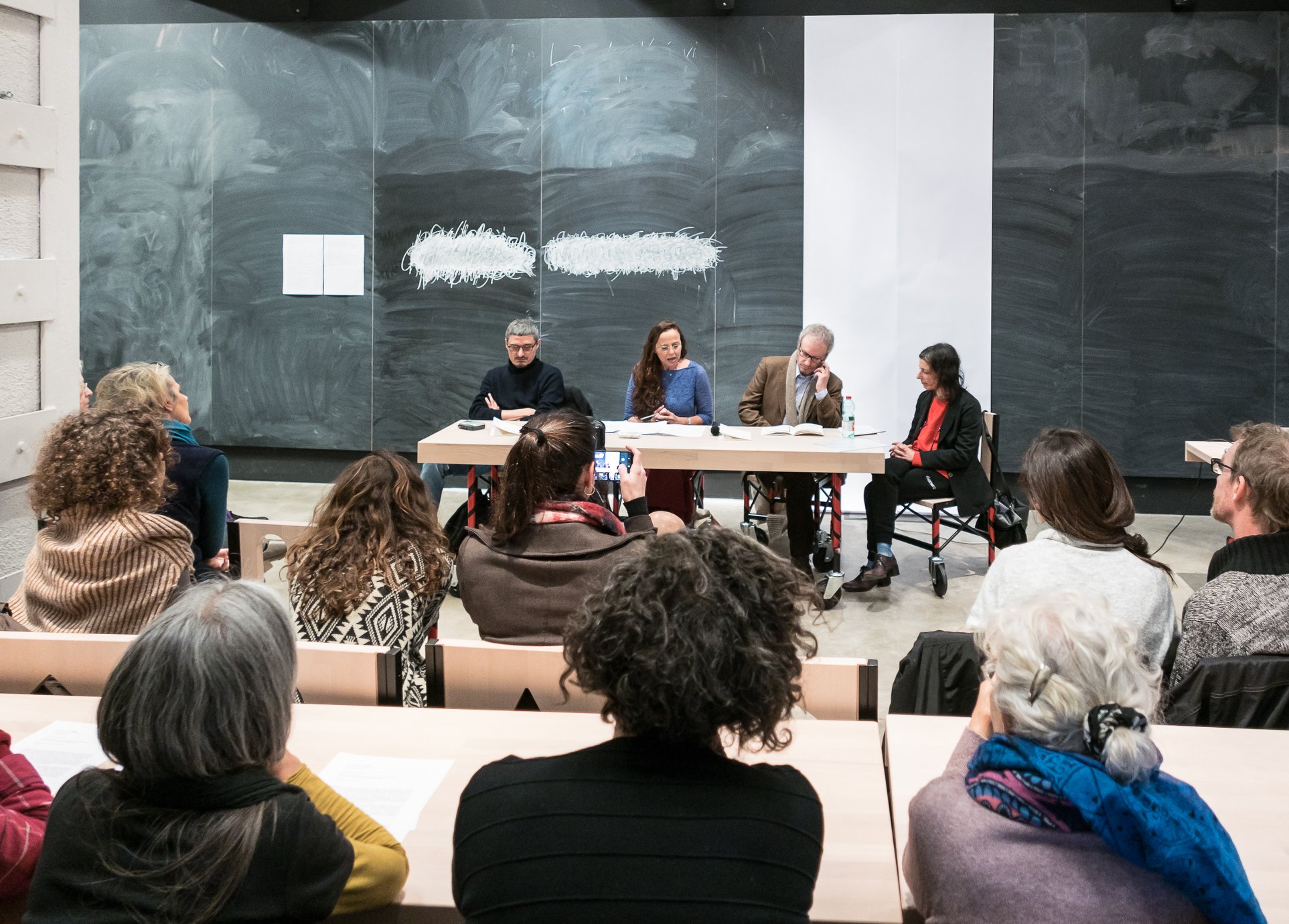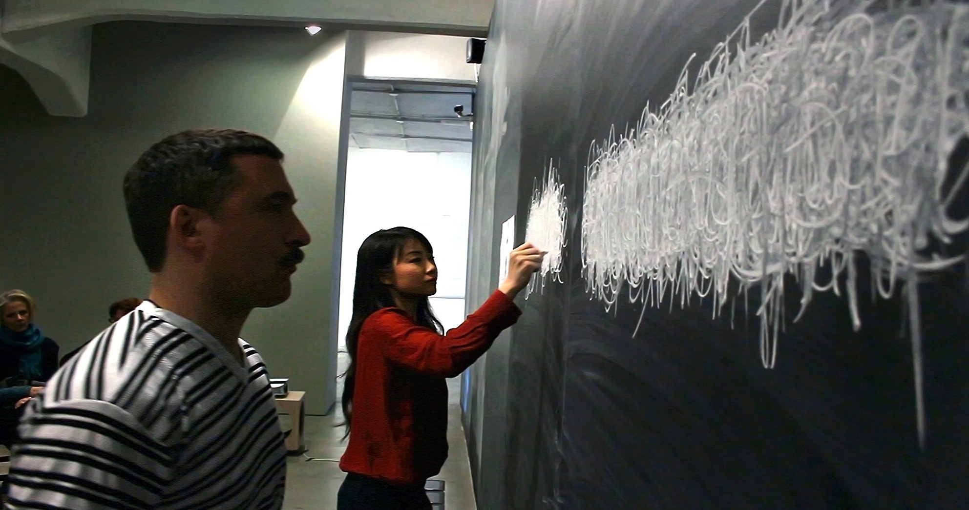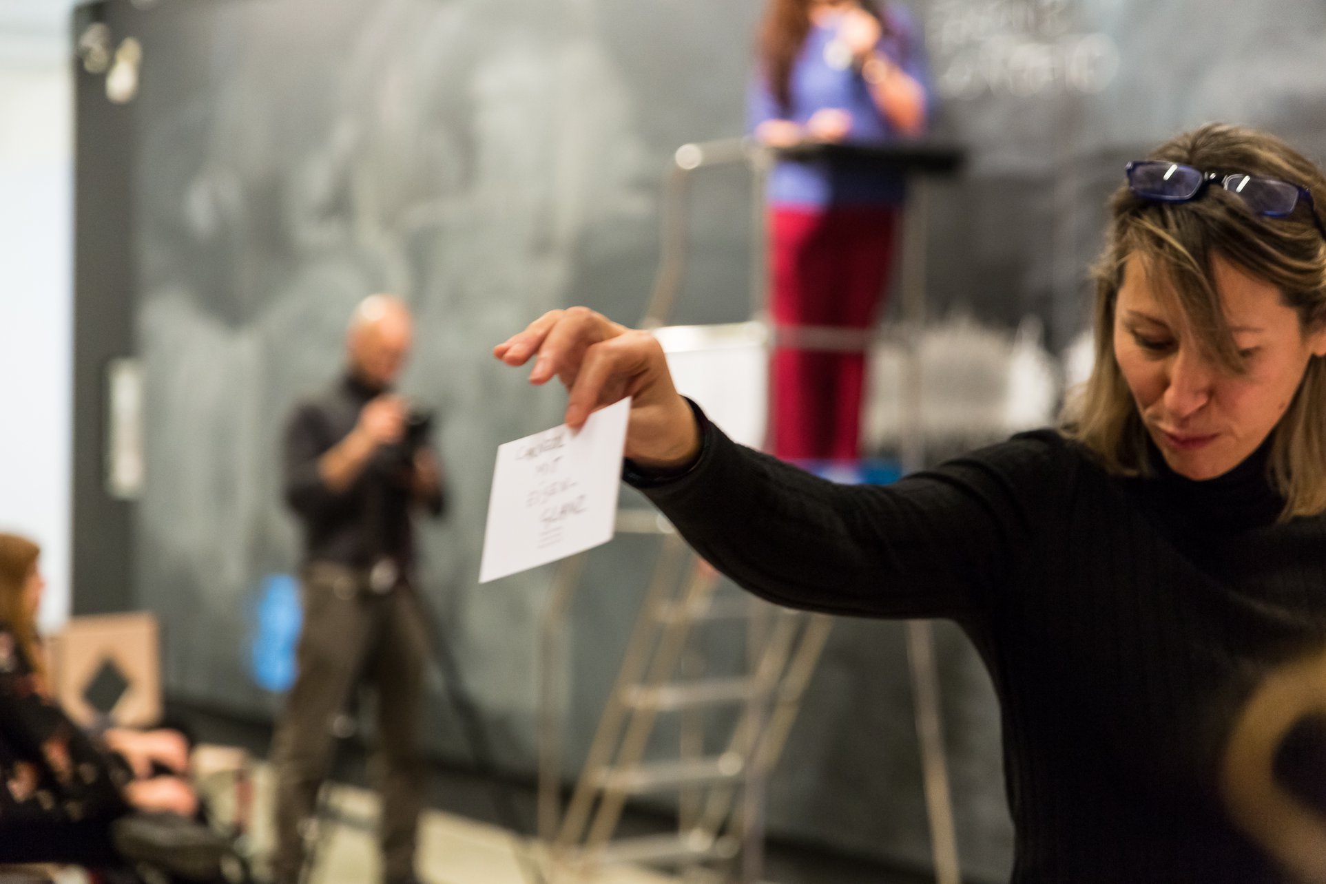 Interventi: (1) D. Borromeo, C. Melica, P. Polidori, F. Santoro: Esercizi di lettura. Scelta di scritti biografici e teorici di artisti. Con la partecipazione di Tianyi Xu e Daniele Villa Zorn. (2) P. Polidori: Introduzione a La linea d’ombra. Il personaggio Beuys. Ipotesi narrativa: ogni persona è un artista, ogni artista è un personaggio, ogni personaggio è una pin up; l’arte come elaborazione teatrale di sé. Tra Joseph Beuys e Vettor Pisani. (3) C. Pietroiusti con F. Hornung, G. Garrera, C. Melica, F. Santoro: Non si finisce mai di rimuovere. Lettura e discussione sulle parole rimosse nelle poesie di Cesare Pietroiusti tradotte in tedesco da Frank Hornung. (4) M. Sartori, Presentazione di due opere sonore: Il suono della lingua (2008); Preghiera a sua madre perché muoia (2016). Ovvero: sulle modalità di materializzazione, traduzione e ricomposizione della lingua a partire da un dato testo poetico. (5) P. Polidori con C. Melica, T. Xu, D. Borromeo et al.: Lettura d’attesa / Erdbeeren – Erdbeben. Scelta di brevi testi provenienti dai disegni di Beuys tradotti all’impronta e trascritti alla lavagna, azione.